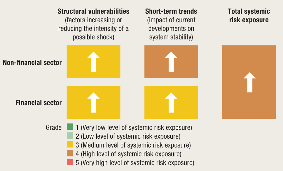 Total systemic risk exposure at the end of the first quarter of 2020 is assessed as high (Figure 1). The increase in the overall risk assessment compared to the previous issue of Macroprudential Diagnostics was caused by strong macroeconomic and financial shocks associated with the epidemiologic measures to prevent the spread of the coronavirus that have negatively affected most cyclical and some of the structural components of the systemic risk of individual sectors. In response to these shocks, a series of economic, fiscal, monetary and supervisory measures aimed at stabilising the macroeconomic and financial situation were activated (Chapter 2).
