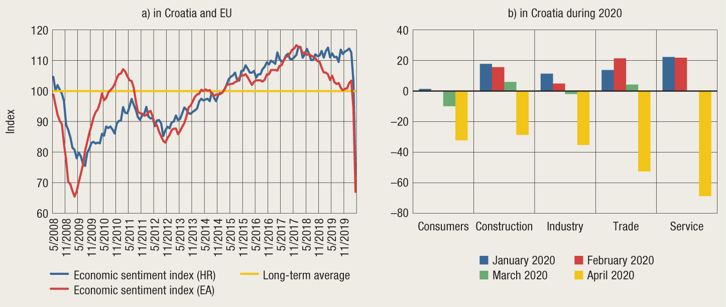 Current economic trends in Croatia deteriorated strongly after the escalation of the coronavirus pandemic. The first data available for March and the first half of April indicate a strong contraction of economic activity. Thus, there was a decline in the number of employed persons and a substantial growth in the number of unemployed persons (1.5% down and 9.9% up, respectively, March 2020). These unfavourable trends were mitigated by state measures intended to preserve jobs. According to CES, some 84 thousand employers relied on this measure for slightly less than half a million of their employees. Tax Administration data indicated a substantial drop in fiscalised receipts. In the period from 24 February to 3 May 2020, they reached some 33% of those in the comparable period last year for all activities, while accommodation and food service activities registered a fall of as much as 92%. Similar trends are indicated by consumer and business confidence surveys conducted in March and April (Figure 2), with a steep decline in the economic sentiment index, which dropped to early 2009-levels. Especially prominent are pessimistic expectations regarding services and trade and the expected economic and financial situation of households in 12 months compared to the situation at the time of the survey.