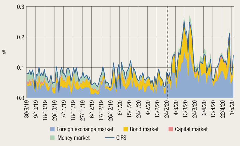 The exceptional volatility in the financial markets following the outbreak of the crisis, pushed short-term risks in this segment strongly upwards. They are now assessed as high. International financial markets have been marked by strong fluctuations in prices of almost all types of assets, by the freezing of individual market segments and by the growth in demand for cash and highly liquid types of assets. In these circumstances, the leading central banks have announced unprecedented quantities of liquidity in order, combined with their governments’ measures, to prevent panic and try to ensure an uninterrupted flow of funding to the financial and the real sectors, focusing on entities whose operations have especially suffered from epidemiological measures.