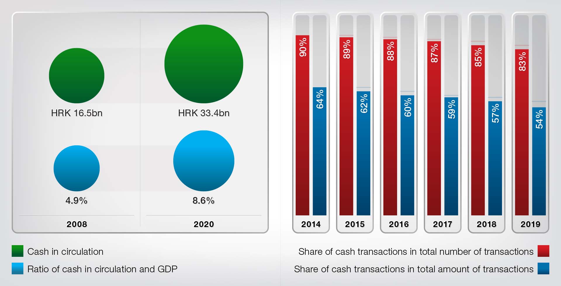 FIGURE 2 Stock of cash is rising and it is a main mean of payment in Croatia, but its share in transactions is gradually declining