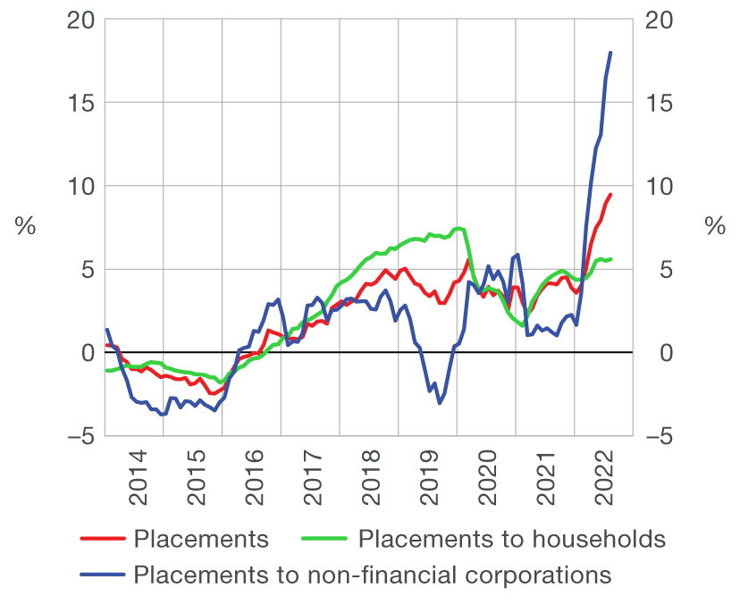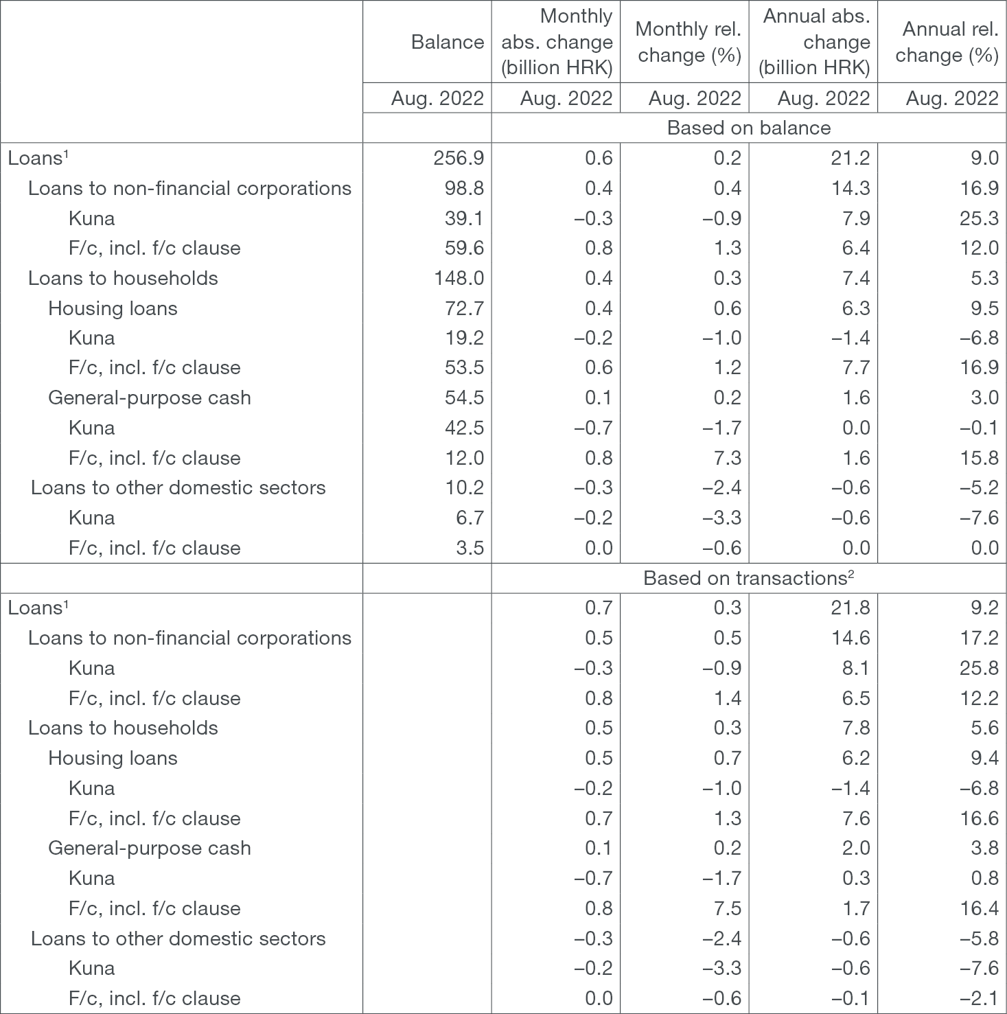Total placements of monetary institutions to domestic sectors (except the central government) grew by HRK 0.7bn in August (or 0.3%, based on transactions) and their annual growth accelerated from 8.9% in July to 9.5% in August (Figure 2). The monthly increase in placements was completely accounted for by loans as the prevailing item of placements (Table 2), with loans to non-financial corporations and loans to households growing by almost the same amount (HRK 0.5bn). Notwithstanding the slower monthly growth in corporate loans, which was due to the base effect, that is, the drop in corporate loans in August 2021, their annual increase accelerated further (to 17.2% in August, up from 15.7% in July). Demand for loans remained fairly robust owing to the soaring prices of imported energy products and raw materials, which increased the cost of their procurement, as well as corporate attempts to borrow before the tightening of financing conditions. As regards household loans, after growing rapidly for three months, they rose only marginally in August, mostly on the back of housing loans (HRK 0.5bn). Such trends in household loans reflect the effect of the last round of the government housing loans subsidy programme. General-purpose cash loans also edged up (by HRK 0.1bn). The increase in housing and general-purpose cash loans accelerated slightly in annual terms (to 9.4% and 3.8%, respectively), so that the annual growth rate of total household loans grew only barely, from 5.5% to 5.6%.