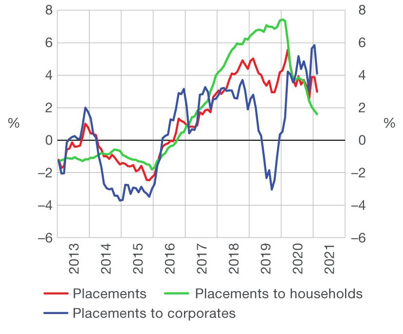 Total placements of monetary institutions to domestic sectors (except the central government) increased negligibly in February. Placements to households increased mildly, to the greatest extent due to subsidies to housing loans, while placements to corporates remained virtually unchanged. The growth of total placements on an annual level slowed down substantially due to the base period effect, i.e. intensive lending in February of last year.
