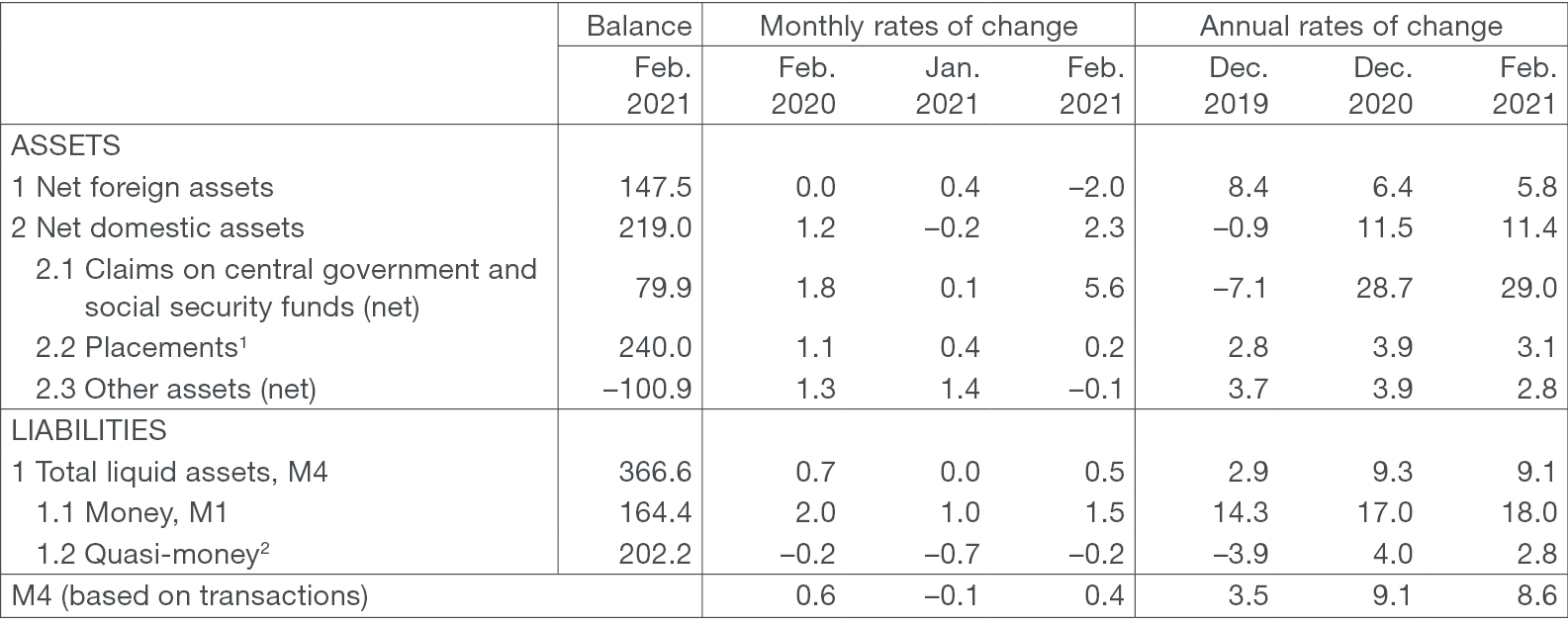 Total liquid assets (M4) and money (M1) increased in February 2021. The growth of both M4 and M1 slowed down slightly on an annual level, oscillating within their usual monthly bands. Monetary aggregates, nevertheless, continued their strong growth.