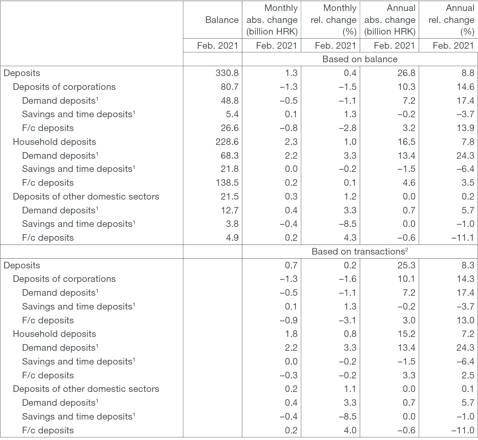 Total liquid assets (M4[1]) increased in February 2021 by HRK 1.3bn (0.4%, based on transactions), reaching HRK 366.6bn at the end of the month (Table 1), as a reflection of the increase in net domestic assets (NDA) of the monetary system and the decrease in net foreign assets (NFA). The increase in NDA was largely accounted for by the noticeable increase in net claims from the central government and the fall in NFA by the decrease in assets abroad. As regards the components of total liquid assets, money (M1[2]) went up by HRK 2.4bn (1.5%) from the previous month, primarily due to the increase in demand deposits of households and a mild increase in money outside credit institutions in February. In the same period, quasi-money decreased by HRK 1.0bn (0.5%, based on transactions), to the greatest extent due to the contribution of the decrease in foreign currency deposits of non-financial corporations (Table 3). On the annual level, the growth of M4 slowed down slightly from 8.8% in January to 8.6% in February and the growth of M1 from 18.7% to 18,0%, based on transactions (Figure 1).