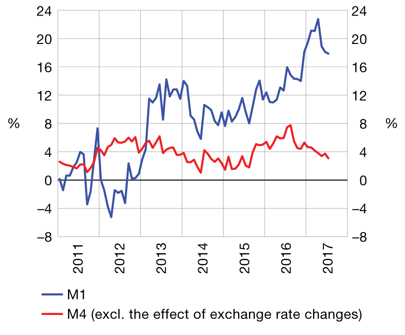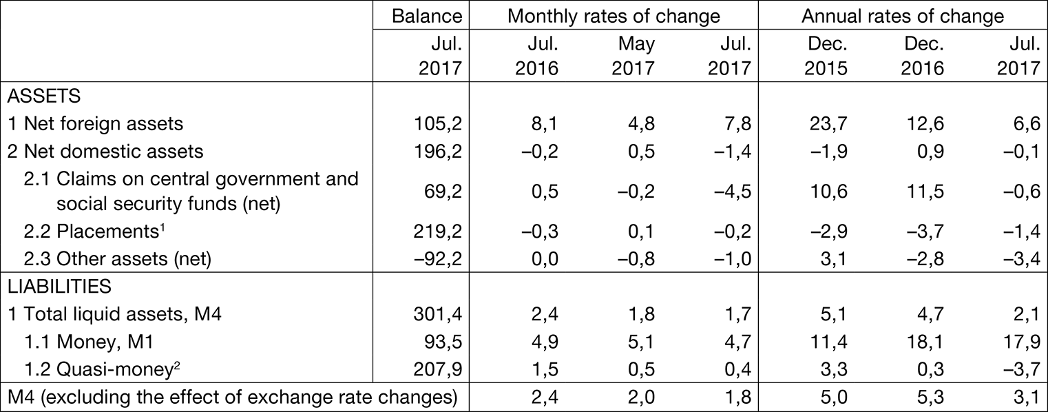 Total liquid assets (M4) amounted to HRK 301.4bn at the end of July 2017, up by HRK 4.9bn or 1.7% on the end of June (Table 1). This was predominantly driven by the seasonal increase in money (M1) of 4.7% during the peak tourist season. Quasi-money, the second M4 component, increased by 0.4% in July thanks to seasonal growth in foreign currency deposits of non-financial corporations. The annual growth of the broadest monetary aggregate, M4, slowed down in July to 3.1% (excluding the effects of exchange rate changes), from 3.7% at the end of the previous month (Figure 1). This was primarily a result of the acceleration in the annual decline of kuna non-monetary deposits. The annual growth of money (M1) remained very high (17.9%).