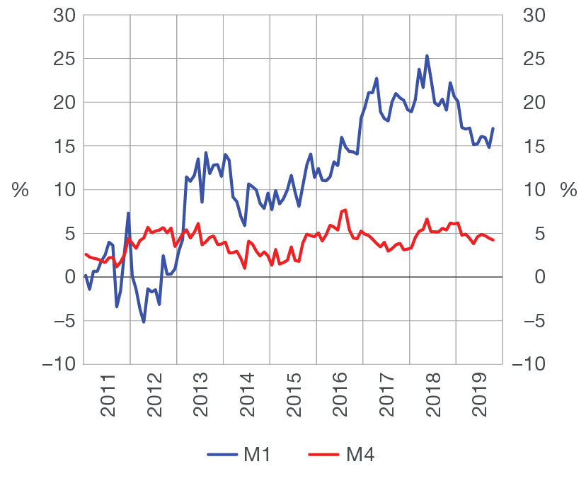 Total liquid assets (M4) stood at HRK 334.9bn at the end of October 2019, down 0.8% from the previous month (based on transactions, Table 1). If analysed on an annual basis, the growth in total liquid assets (M4) slowed down to 4.2% in October 2019 (Figure 1). The annual fall of quasi-money deepened to –2.6% (based on transactions) at the end of the month, while the annual growth of money (M1) accelerated to 17.0%, mostly due to the acceleration in the growth of demand deposits.