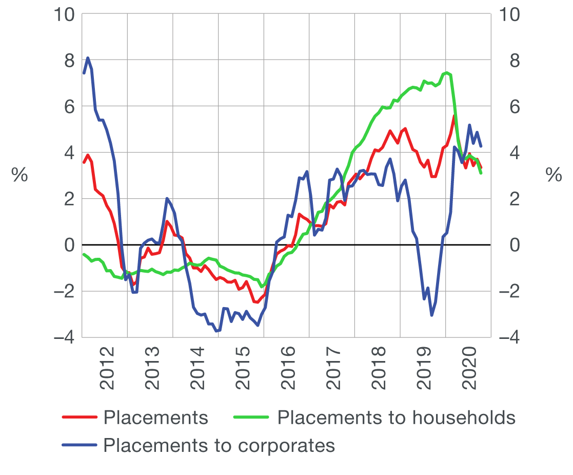 The total placements of monetary institutions to domestic sectors (excluding the central government) rose slightly in October after falling in the previous two months. Household placements continued to grow slowly, while loans to non-financial corporations fell at a somewhat slower rate than in the preceding months. The annual growth in total placements slowed down, mirroring the waning of the base effect of a relatively large increase in placements towards the end of the previous year, associated also with the period of the implementation of the housing loan subsidy programme.