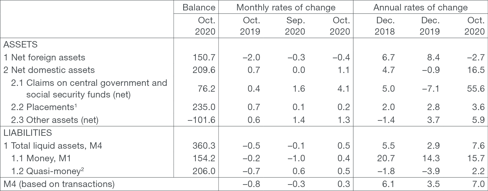 The increase in net domestic assets of monetary institutions in October 2020 led to an increase in total liquid assets (M4), accompanied by a decrease in net foreign assets. The annual growth in M4 also accelerated slightly.