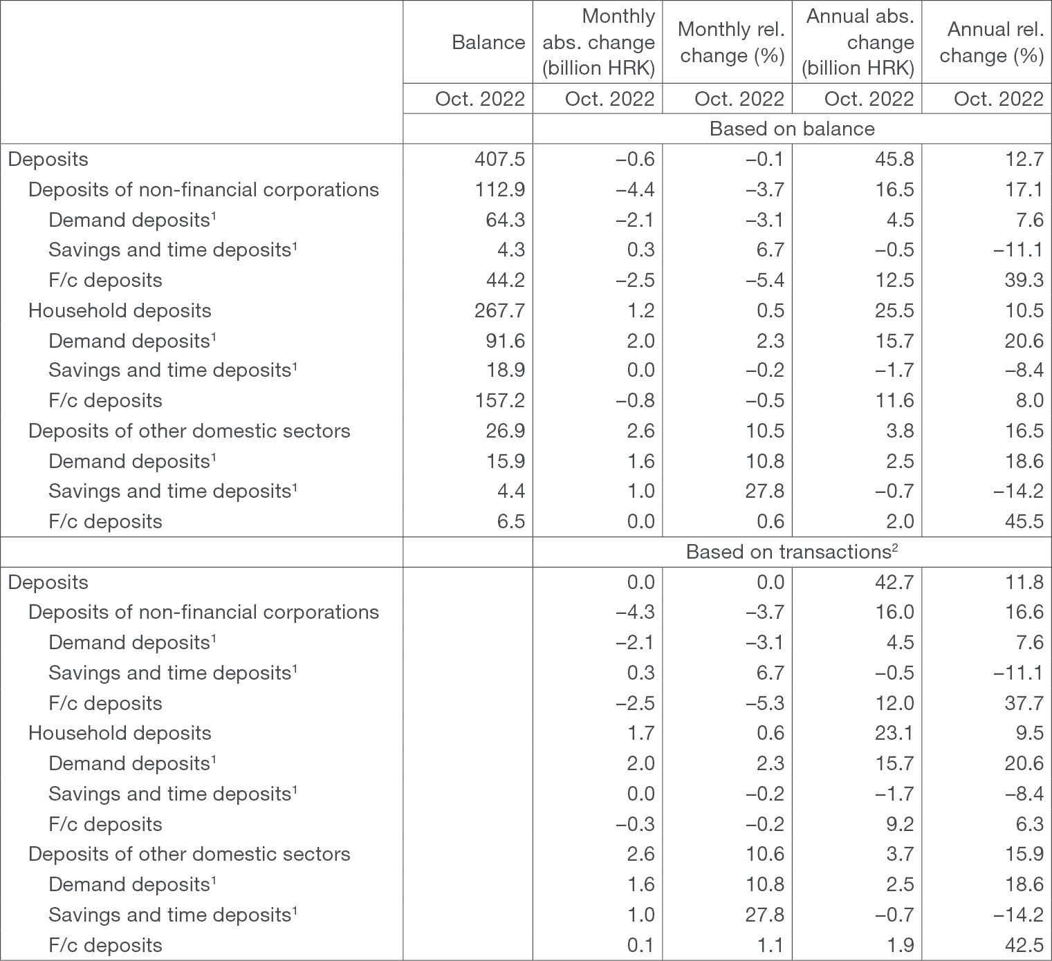 Total liquid assets (M4[1]) fell by HRK 2.9bn (0.7% transaction-based) in October, mirroring the fall in net foreign assets (NFA) of the monetary system, partly mitigated by the increase in net domestic assets (NDA) (Table 1). Money (M1[2]) also fell on a monthly level (HRK 1.3bn or 0.7%, transaction-based), driven by a further strong decline in currency outside credit institutions of HRK 2.9bn ahead of the introduction of the euro. The October fall in quasi-money of HRK 1.5bn or 0.6% (transaction-based) is due to the fall in foreign currency deposits that followed their sharp growth over the previous months, particularly to the fall in corporate deposits that fell by HRK 2.5bn, mainly as a result of eurobonds repayment by one large enterprise (Table 3). The growth in M1 continued to decelerate strongly on an annual level, having fallen from 18.0% at the end of last year to 7.4% in October, while the slower deceleration in the annual growth of M4 (8.4%, transaction-based, down from 10.4% at the end of the previous year, Figure 1) reflects a faster growth in quasi-money than last year.