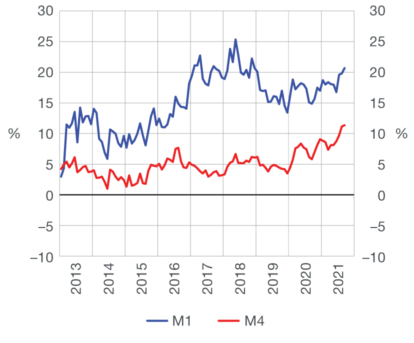 Total liquid assets (M4[1]) fell by HRK 0.5bn (0.1%, based on transactions) at the end of September from the month before. Net domestic assets (NDA) declined sharply, with a strong rise in net foreign assets (NFA) of the monetary system (Table 1), which is mostly due to the inflow of foreign exchange from the European Commission’s pre-financing payment under the National Recovery and Resilience Plan to the government’s account kept with the CNB. Money (M1[2]) also went down by HRK 0.5bn (0.3%) in September, reflecting a fall in currency outside credit institutions at the end of the peak tourist season, whereas demand deposits witnessed a growth. Quasi-money increased slightly from the previous month, owing to the rise in foreign currency deposits of households and corporations, which was somewhat stronger than the drop in kuna deposits (Table 3). Despite the monthly fall, the annual growth rates of M4 and M1 accelerated from 11.1% and 19.8% in August to 11.4% and 20.7% in September, due to a more pronounced drop in these monetary aggregates in September last year (base effect) (Figure 1).
