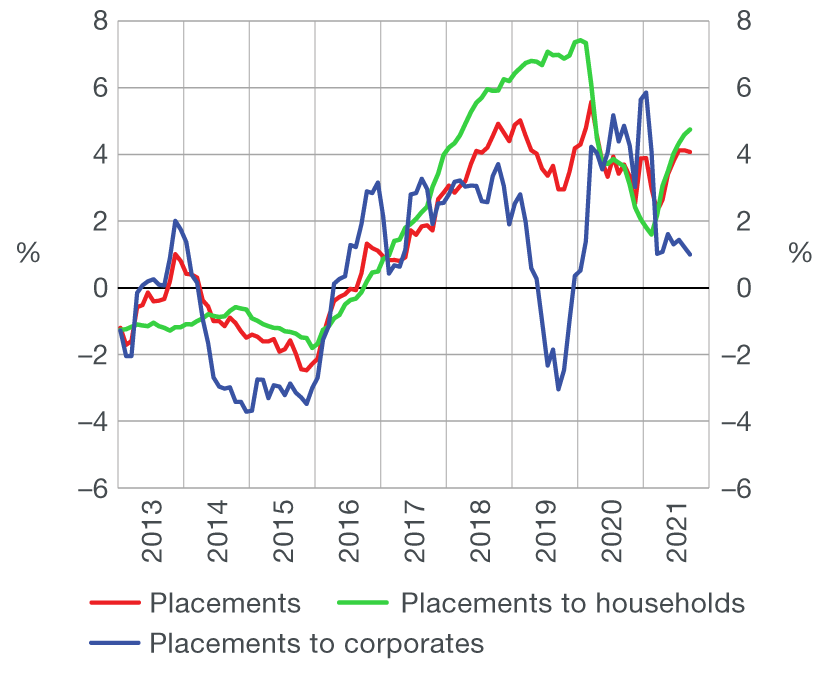 Total placements of monetary institutions to domestic sectors (except the central government) also witnessed a mild monthly decrease, although placements to households increased due to a further rise in housing loans, as well as a resurgence of general-purpose cash loans.