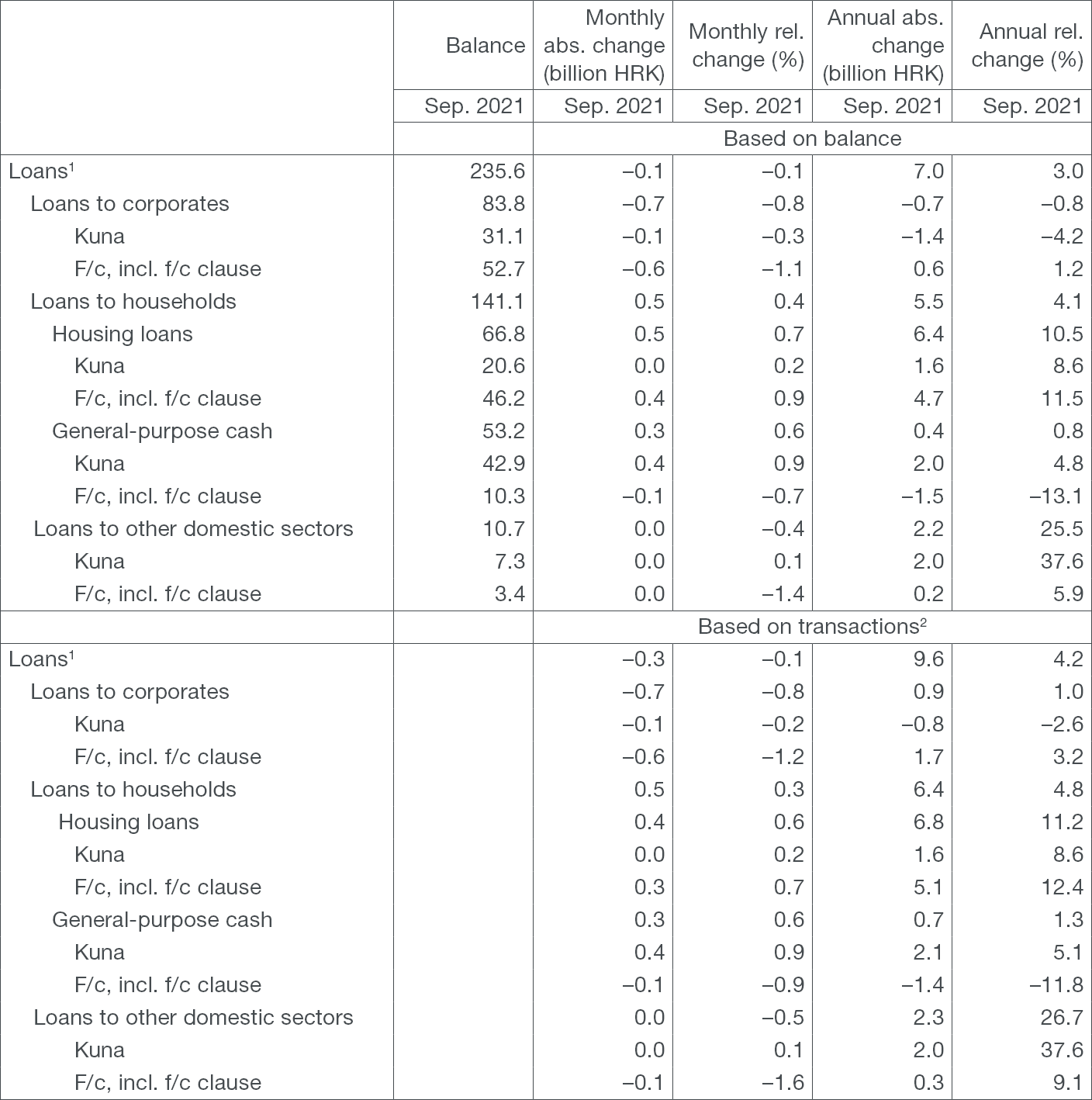 Total placements of monetary institutions to domestic sectors (except the central government) continued to decrease (by HRK 0.2bn or 0.1%, based on transactions) in September from the month before, ending the month at HRK 241.3bn. The annual growth rate of total placements remained unchanged at 4.1% for the third month in a row (Figure 2). The monthly drop in placements was driven by a decline in total loans (HRK 0.3bn or 0.1%), accounting for the largest share of placements. Loans to corporates decreased (HRK 0.7bn or 0.8%), and their annual growth rate edged down from 1.3% to 1.0%. On the other hand, loans to households grew by HRK 0.5bn or 0.3%, with the largest contribution to the increase in household lending still stemming from housing loans, which grew by HRK 0.4bn (0.6%), with a continued resurgence of general-purpose cash loans (HRK 0.3bn or 0.6%) (Table 2). On an annual level, the growth of housing loans continued to accelerate, from 10.8% in August to 11.2% in September, as was the case with general-purpose cash loans (from 0.8% to 1.3%), resulting in an acceleration of the growth of total loans to households, from 4.6% to 4.8%.