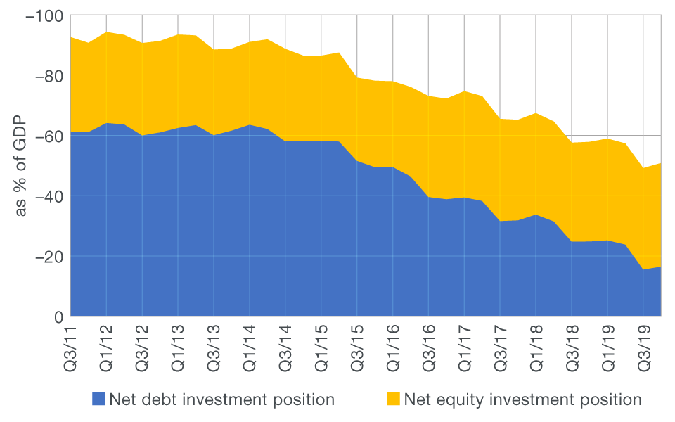 The net inflow of capital in the financial account of the balance of payments has, together with an unfavourable effect of price, exchange rate and other adjustments, resulted in a deterioration in the relative indicators of the international investment position in the fourth quarter of 2019. At the end of 2019, the net international investment position thus stood at EUR –27.4bn, or –50.8% of GDP (Figure 2).
