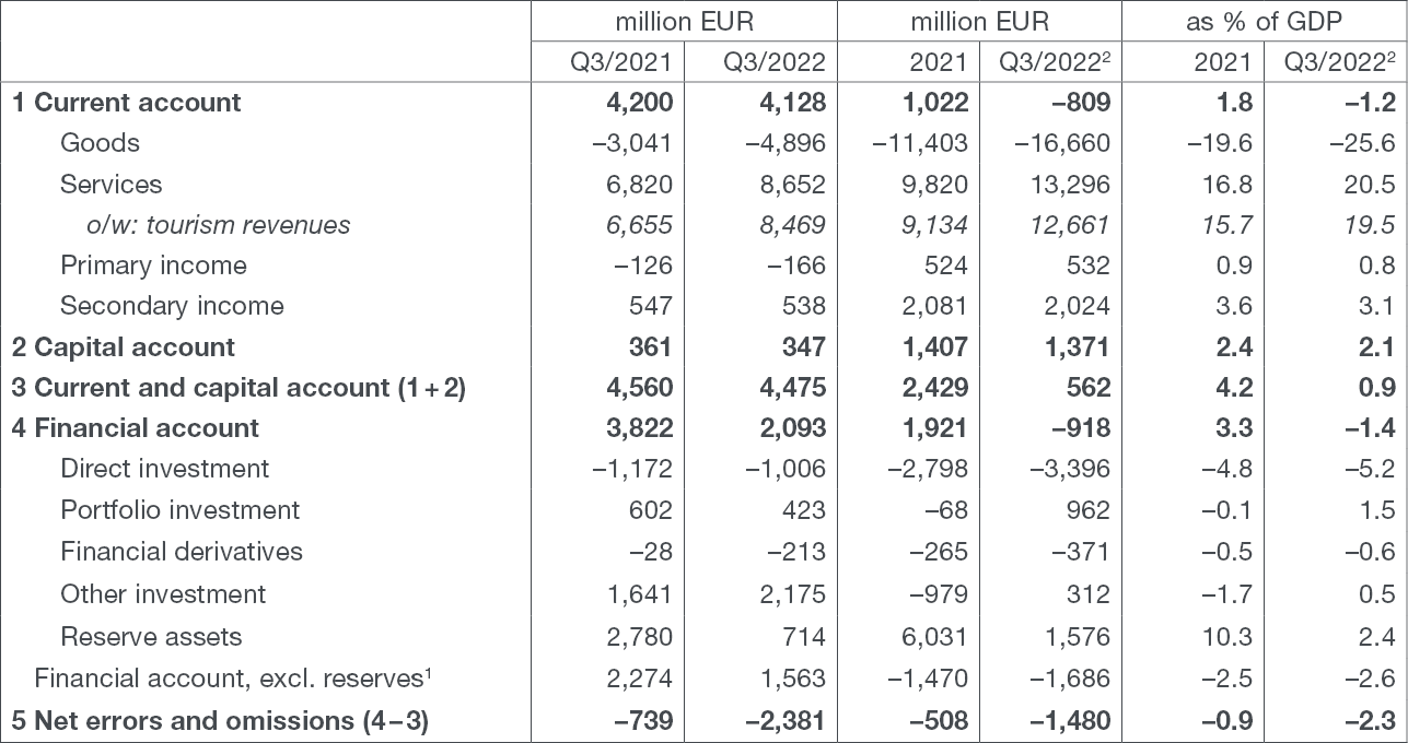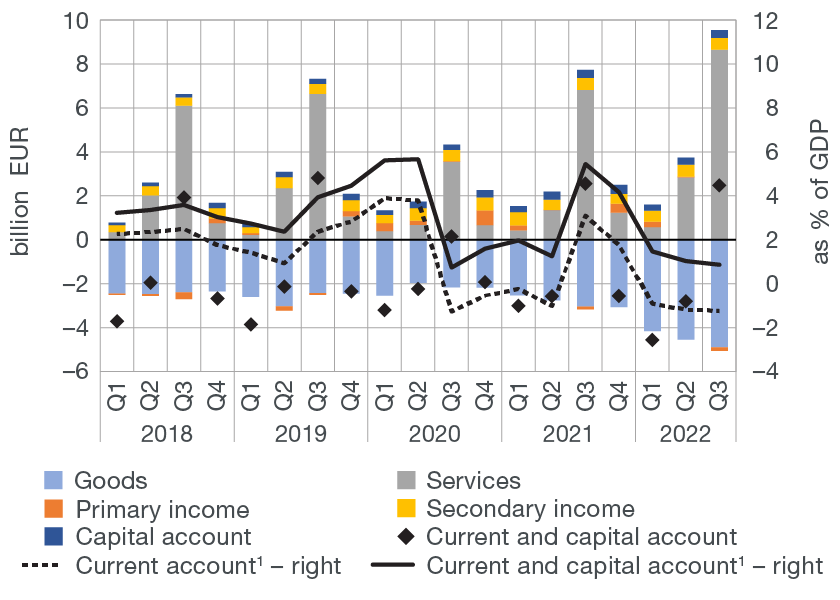 The strong growth of tourism revenues in the third quarter neutralised the impact of expensive raw materials and energy products on the widening of the goods deficit. As a result, the current and capital account surplus in the balance of payments was only slightly lower than in the same period of the previous year. However, due to the prevalence of these unfavourable effects in the first half of the year, the cumulative surplus in the current and capital account decreased sharply in the last four quarters from 2021.