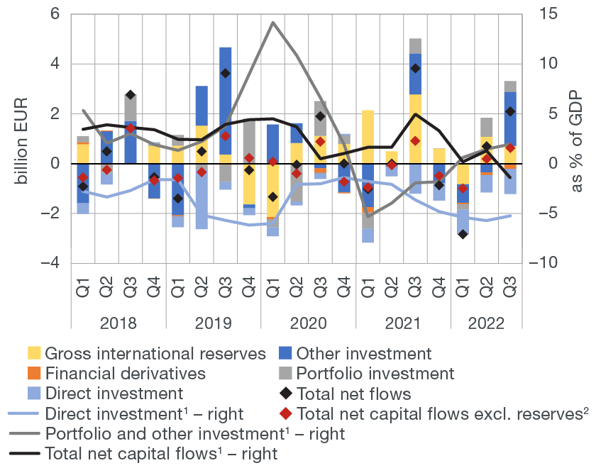 The financial account of the balance of payments recorded a net outflow of EUR 2.1bn in the third quarter of 2022, which is a decrease of EUR 1.7bn from the same period of the previous year (Figure 1b). The gross international reserves grew less strongly than in the same period of the previous year on the account of much smaller increase in the government’s foreign currency deposit with the CNB and the fact that a noticeable increase in reserves was observed in the same period of the previous year after the allocation of special drawing rights of the International Monetary Fund (IMF). However, given that the foreign liabilities of the central bank increased by the same amount as a result of this allocation, their impact on the CNB’s net foreign position was neutral. Net outflow, excluding the change in reserves and liabilities of the CNB, was smaller, totalling EUR 1.6bn, which is a decrease of EUR 0.7bn from the third quarter of 2021. This primarily reflects the developments in the sub-account of other investment, i.e. although a noticeable net outflow in the account of other investment was also recorded in the summer months of 2022, due to a strong seasonal improvement in the net foreign position of banks, it was smaller than in the previous year, if the aforementioned effect of liabilities of the CNB is excluded. As a result, banks’ funds within the TARGET2 system managed by the central bank were reduced in the third quarter of 2022, while their level remained unchanged in the same period of the previous year. In addition, net outflow was recorded in the portfolio investment account as a result of a decrease in liabilities arising from government long-term securities due to transactions in the secondary market. However, it was also smaller than in the same period of the previous year. By contrast, net inflow in the direct investment account was somewhat weaker than in the previous year, primarily due to a smaller inflow of direct equity investments in Croatia.