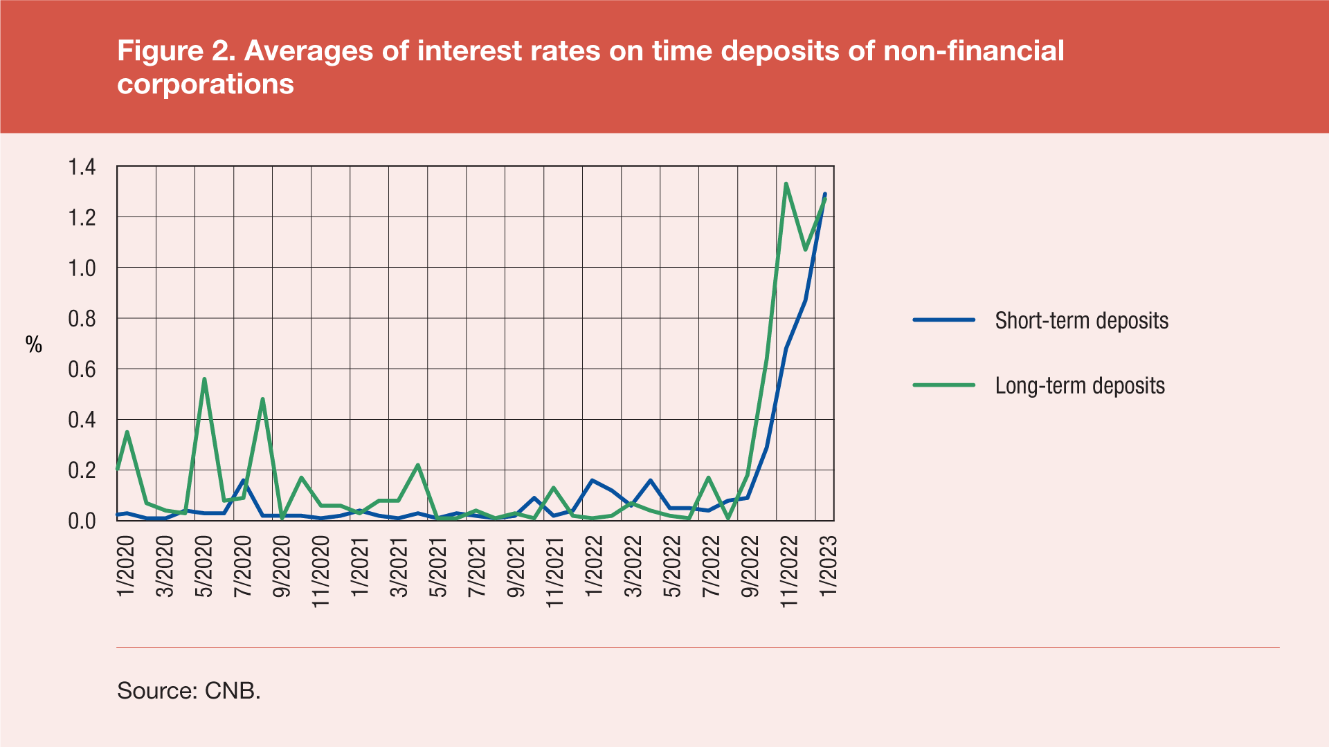 The averages of interest rates on euro time deposits of non-financial corporations witnessed a much sharper growth relative to households, reaching 1.29% for short-term deposits and 1.27% for long-term deposits in January 2023. This is an increase of 1.00 percentage point for short-term deposits and of 0.63 percentage points for long-term deposits relative to October 2022, and a rise of 1.13 percentage points for short-term deposits and of 1.26 percentage points for long-term deposits from January 2022. Thus, the averages for long-term and short-term deposits hit their highest levels since 2017 and 2014 respectively.