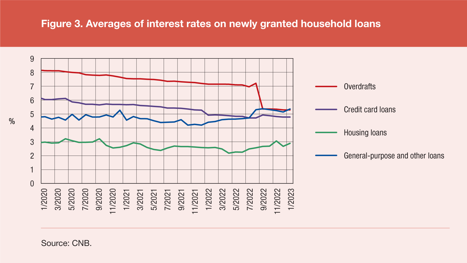 Statistical indicators of interest rates of credit institutions on the most important types of loans granted to households and non-financial corporations mostly trended up from the second half of 2022, with the exception of loans in the form of transaction account overdrafts and credit card loans, which continued a years-long decline in the averages of interest rates.