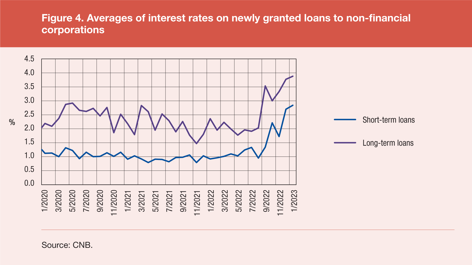 As regards the main categories of loans to non-financial corporations, the averages of interest rates on short-term and long-term loans continued their months-long upward trend in January 2023, with both of these averages reaching their highest levels since 2017. In January 2023, the averages of interest rates on short-term and long-term loans to non-financial corporations in euro were 2.84% and 3.88% respectively. This is an increase of 0.63 and 0.88 percentage points from October 2022 and of 1.92 and 1.52 percentage points from January 2022 for short-term and long-term loans respectively.
