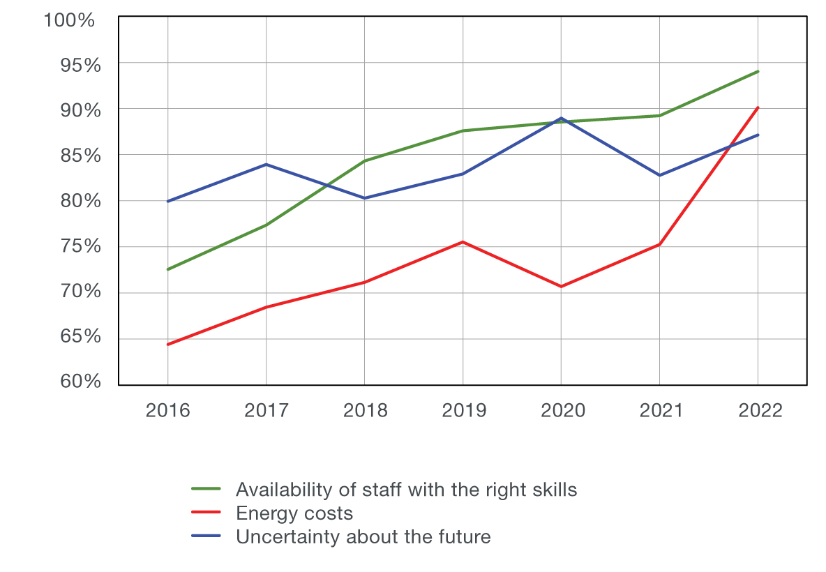 - Energy costs emerge as a key concern for firms, together with uncertainty and skills gap.