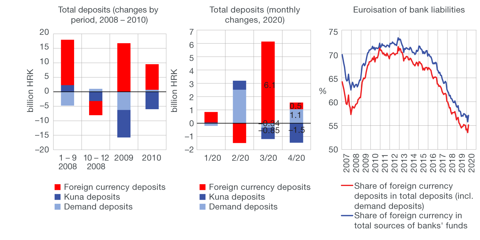 Although the outflow of deposits from banks was avoided, the tendency to hold foreign currency (particularly the euro) strengthened again due to the fear of depreciation. Domestic sectors’ foreign currency deposits in March and April 2020 increased by HRK 6.6bn[3], while kuna deposits decreased by HRK 1.6bn (including demand deposits, i.e. current and giro account balances) (Figure 1, centre). Consequently, the share of foreign currency in total bank funding sources increased from 55.8% at the end of February to 57.3% at the end of April (Figure 1, right). During the previous crisis, households and other domestic sectors substituted kuna by foreign currency deposits throughout 2009 and to a lesser extent in 2010 (Figure 1, left). The share of foreign currency deposits in total bank funding sources then increased from 63% in September 2008 to 72% in December 2010.[4] If trends from the previous crisis repeat in this crisis, the increase in the deposit euroisation could also be expected to continue in the coming months.