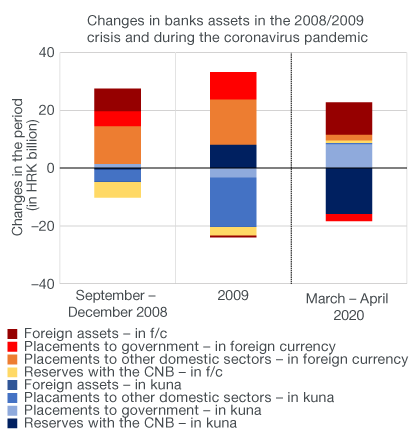 onset of the global financial crisis in September 2008 led to a strong, but temporary withdrawal of household deposits from banks, while in the crisis caused by the coronavirus it was not the case. In October 2008, household deposits with banks fell by as much as HRK 5.4bn, but their outflow was soon halted, after which depositors returned their savings to the banks, but mostly in foreign currency. In contrast to 2008, in March 2020, when the pandemic started to have a more considerable impact on Croatia, total household deposits with banks jumped by a high HRK 2.1bn and total deposits of all sectors by HRK 4.9bn, three times more than the average monthly growth in the previous year.[2] Deposits continued to grow in April, although at a more moderate pace. This confirms that households today have more confidence in the stability of the banking system than twelve years ago. ir confidence is justified, since the origin of this crisis is not in the financial system, by contrast to the previous one, and banks today are also even better capitalised, they rely on more stable sources of financing (domestic deposits, not external debt) and are more hedged against risks (they reserve more funds for potential losses from non-performing loans and their debtors are less exposed to exchange rate and interest rate risks due to the larger share of kuna loans and loans granted with a fixed interest rate).