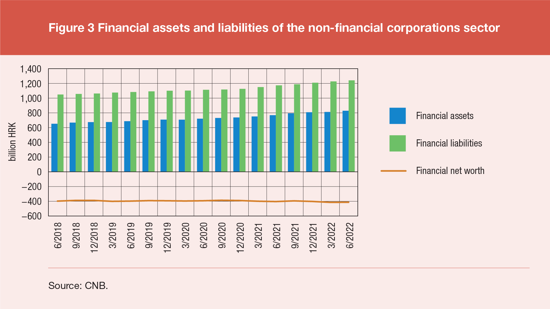 The total financial assets of non-financial corporations stood at HRK 830bn at the end of the second quarter of 2022 (Figure 3), growing by 2.0% from the end of the previous quarter. The financial liabilities of non-financial corporations amounted to HRK 1,242bn or 1.2% more than at the end of the previous quarter. The result of such developments was only the second quarterly increase in the financial net worth of the sector of non-financial corporations since the fourth quarter of 2020, when its downward trend started. It currently stands at HRK –413bn, up by 0.5% from the end of the previous quarter. Over a longer period of time, there was a reversal in these developments, with net worth of corporations decreasing by HRK 8.4bn in the period of one year.