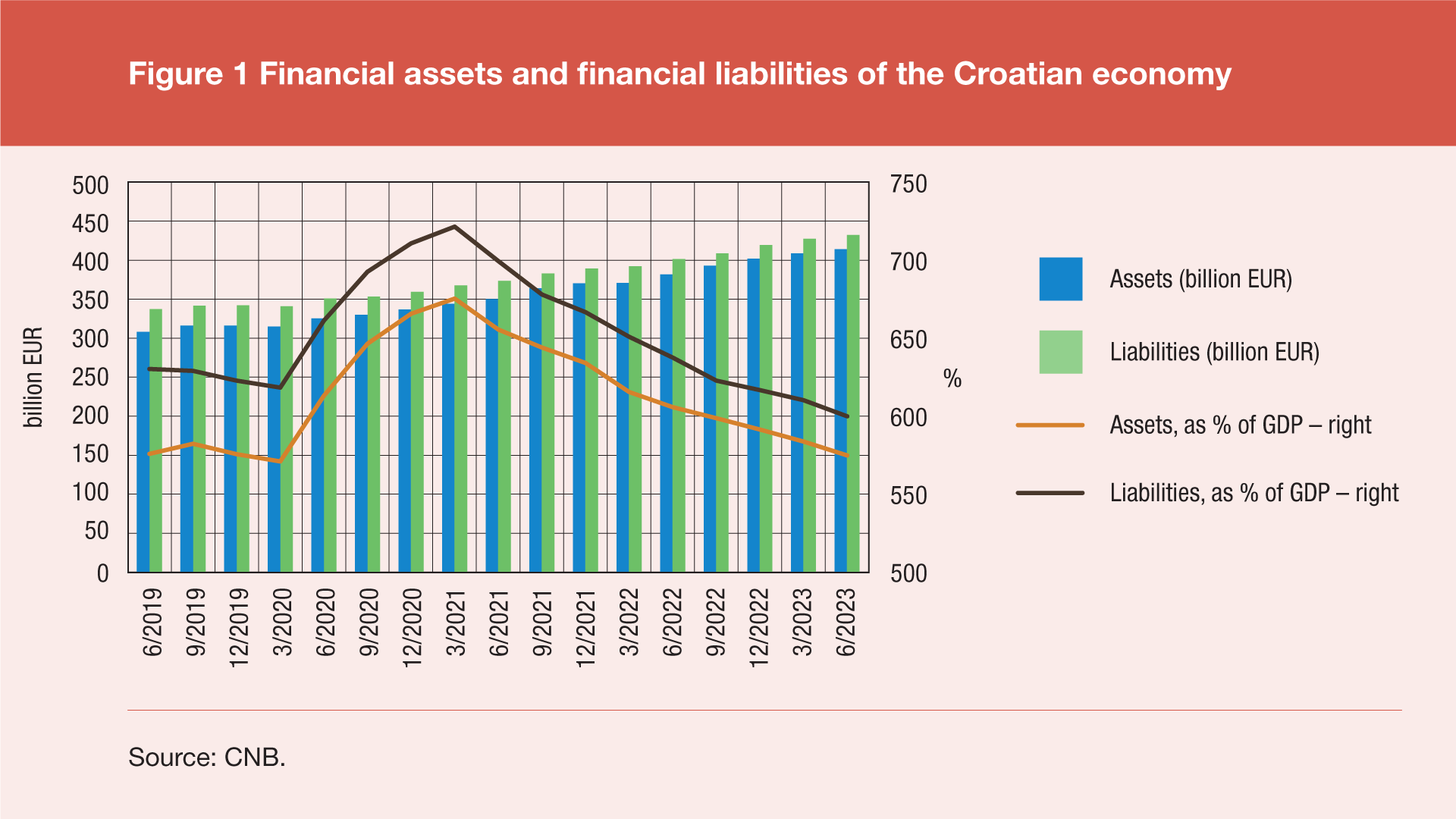 At the end of the second quarter of 2023 (Figure 1), the financial assets of the Croatian economy stood at EUR 414bn, up by EUR 5.3bn in the quarter concerned and up by EUR 32.6bn in the period of one year. The financial liabilities of the Croatian economy stood at EUR 432bn, up by EUR 4.8bn in the quarter concerned and by EUR 30.6bn in the period of one year. In terms of GDP, at the end of the second quarter of 2023, the financial assets of the Croatian economy amounted to 575% of the annual GDP, down by 8.9 percentage points in the quarter concerned and down by 30.9 percentage points in the period of one year. At the same time, the financial liabilities of the Croatian economy decreased by 10.2 percentage points in the quarter concerned and by 37.6 percentage points in the period of one year, accounting for 600% of the annual GDP at the end of the second quarter of 2023. This continued the trend of a decrease of both the assets and liabilities of the Croatian economy in terms of GDP, which started in the second quarter of 2021 due to a slower increase in their value compared to the evident growth of quarterly GDP.
