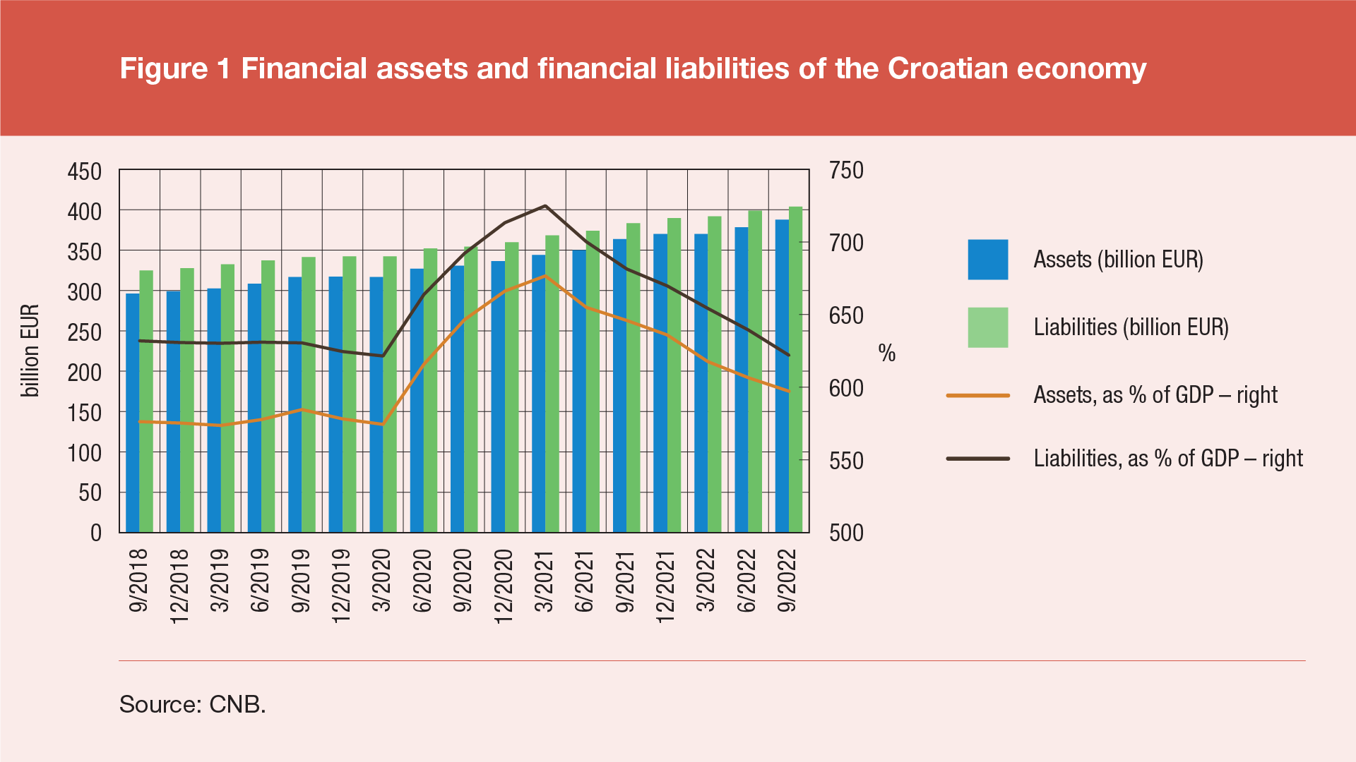 The financial assets of the Croatian economy stood at EUR 388bn at the end of the third quarter of 2022 (Figure 1), up by EUR 9.4bn in the quarter concerned and up by EUR 24.2bn in the period of one year. The financial liabilities of the Croatian economy reached EUR 404bn, up by EUR 5.1bn in the quarter concerned and by EUR 20.4bn in the period of one year. In terms of GDP, the financial assets of the Croatian economy amounted to 597% of the annual GDP at the end of the third quarter of 2022, down by 9.4 percentage points in the quarter concerned and down by 48.7 percentage points in the period of one year. The financial liabilities of the Croatian economy decreased by 17.3 percentage points in the quarter concerned and by 59.3 percentage points in the period of one year, accounting for 622% of the annual GDP at the end of the third quarter of 2022. These quarterly developments continue the trend of decrease of both assets and liabilities of the Croatian economy in terms of GDP, which started in the second quarter of 2021 due to a slower increase in their value compared to the growth of quarterly GDP.