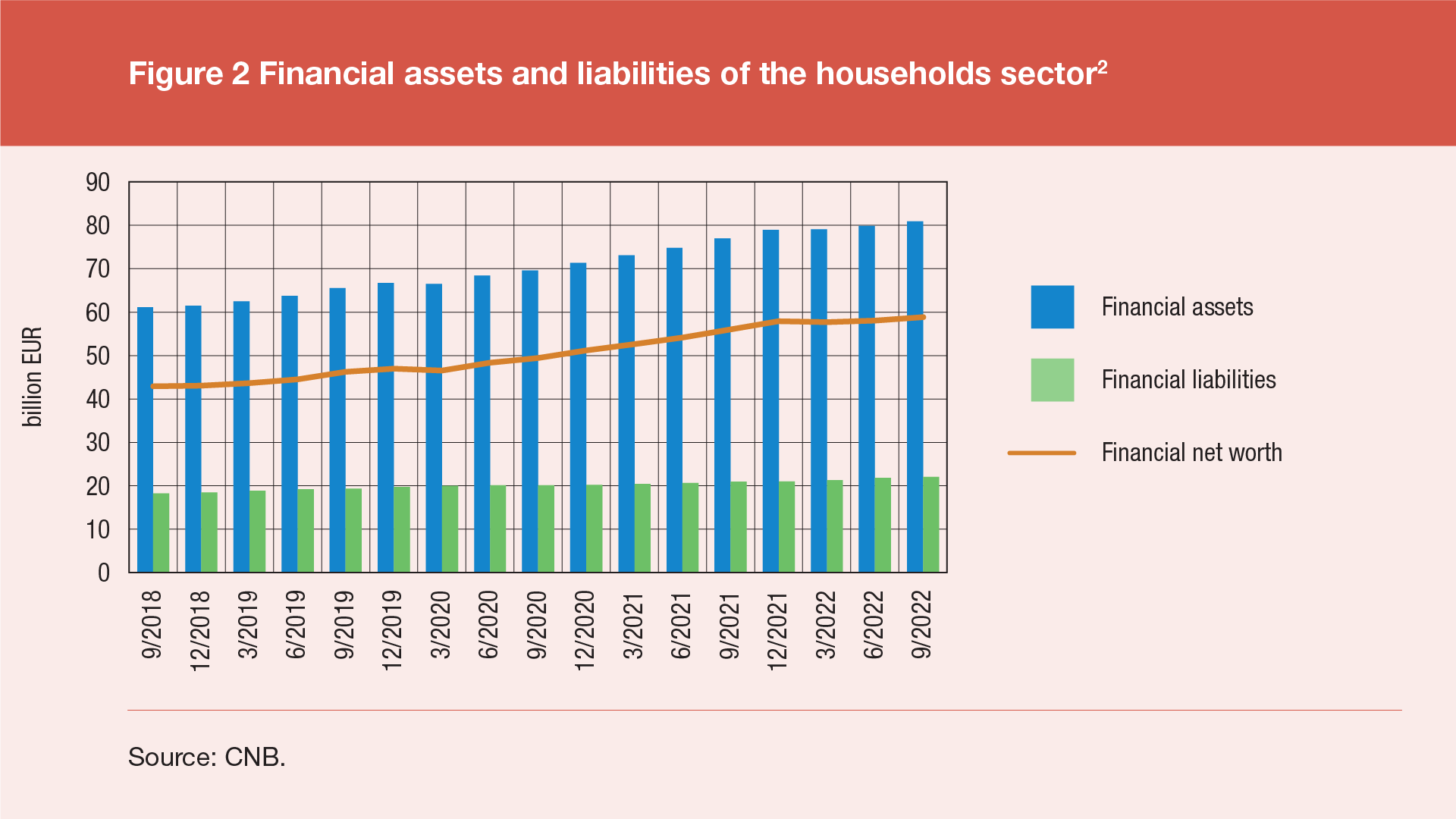 The total financial assets and financial liabilities of households stood at EUR 81bn and EUR 22bn respectively at the end of the third quarter of 2022 (Figure 2), which is an increase of 1.3% and 0.9% respectively from the end of the previous quarter, while in the period of one year, the financial assets of households increased by EUR 3.9bn. As a result, the financial net worth of the household sector amounted to EUR 59bn or 1.4% more than at the end of the previous quarter (i.e. EUR 2.8bn or 5.0% more than at the end of the same quarter of the previous year), and thus the net worth of this sector, showing a trend of accelerated growth since the second quarter of 2020, has increased again following its one-time decrease in the first quarter of 2022.