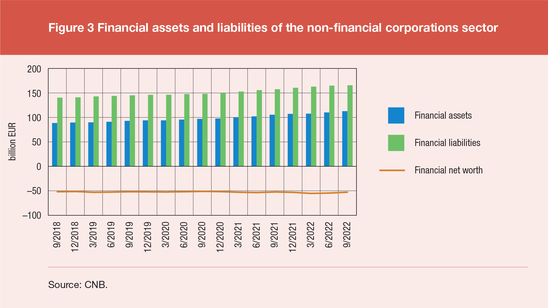 The total financial assets of non-financial corporations stood at EUR 113bn at the end of the third quarter of 2022 (Figure 3), growing by 2.2% from the end of the previous quarter. The financial liabilities of non-financial corporations amounted to EUR 166bn or 0.5% more than at the end of the previous quarter. In line with such developments, the financial net worth of the non-financial corporations sector increased to –EUR 53bn, up by 3.1% from the end of the previous quarter.