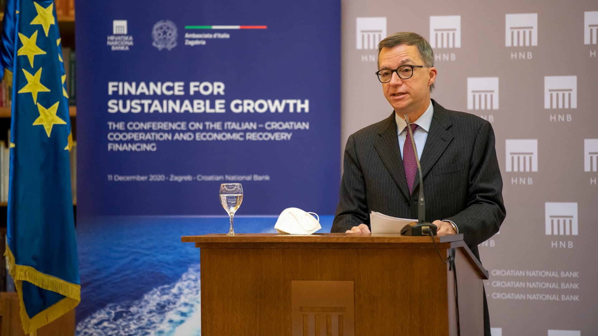 The general idea of this conference is to gather experts from Italy and Croatia to discuss topics that are of high relevance for both of our countries, and that strongly interlink our economies. Our joint objective, which also corresponds to the European long-term objective, is to create economic conditions for a more sustainable growth based on green economy, innovation and digitalisation. Achieving this goal requires financial support for SMEs and for innovative and environmentally friendly projects, said Governor Boris Vujčić in his opening remarks at the online conference on the Italian-Croatian cooperation and economic recovery financing entitled "Finance for Sustainable Growth", which was held on December 11 and jointly organised by the Croatian National Bank and the Embassy of Italy. The Governor noted that the conference offered an opportunity to discuss policies to address these common challenges and stimulate productivity and sustainable growth, possibly also by further enhancing the Italian-Croatian cooperation in tourism, energy and finance.