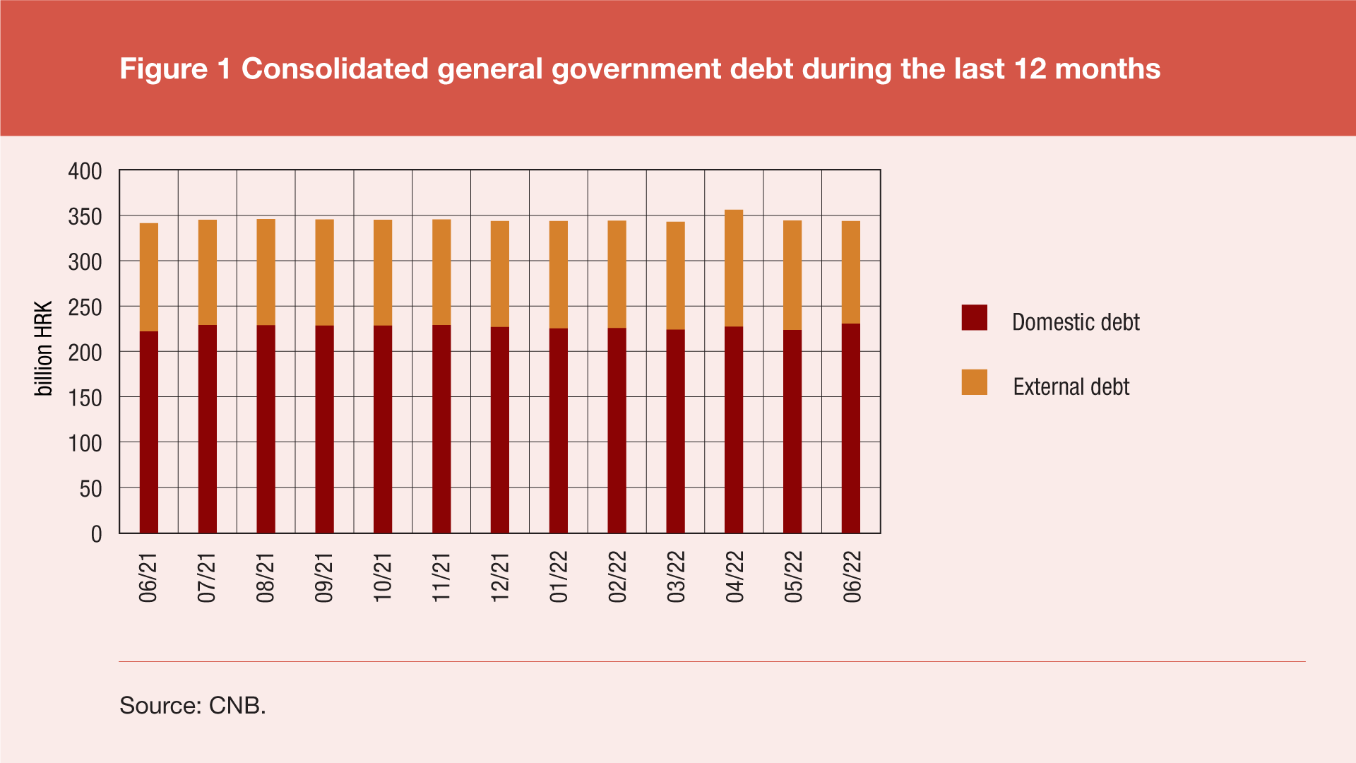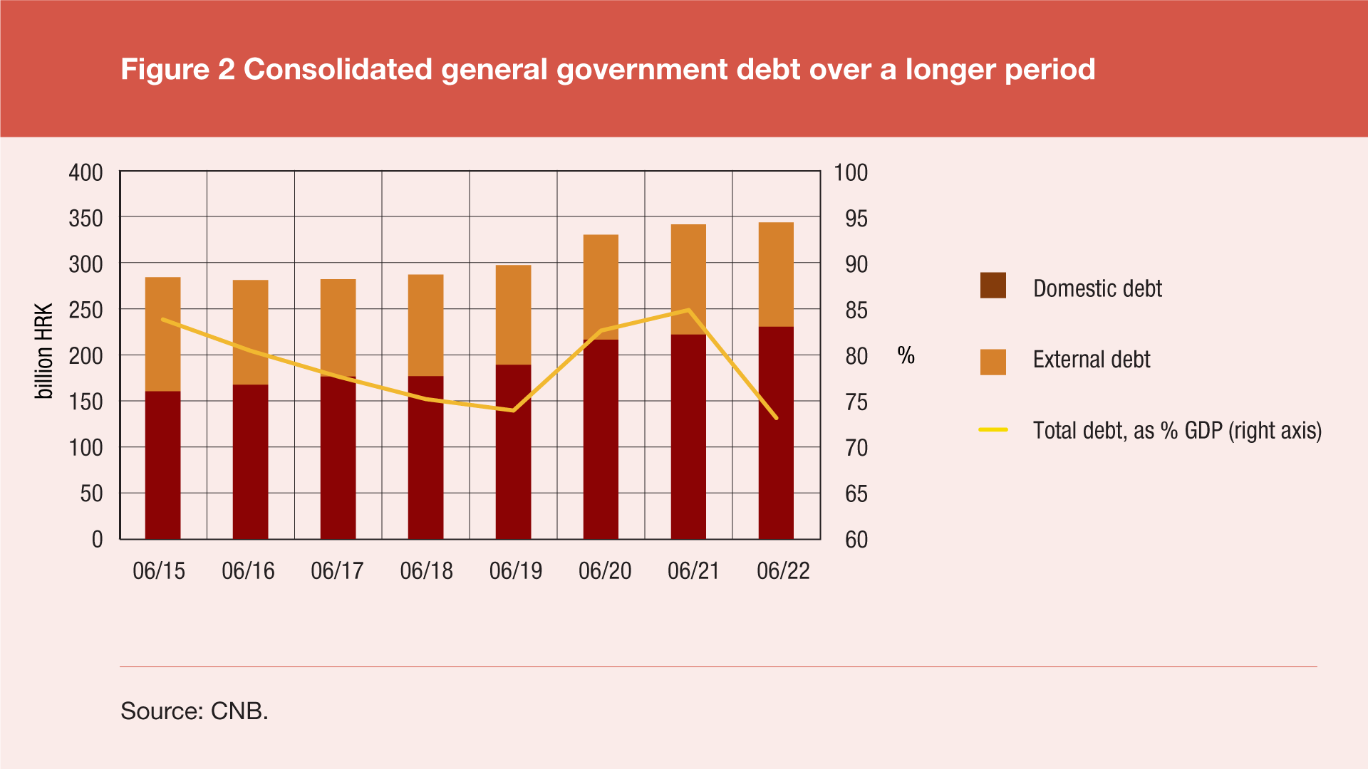 According to the final data of government finance statistics for the second quarter of 2022, the total consolidated debt of all general government sub-sectors[1] reached HRK 343.7bn at the end of June 2022, up by HRK 1.0bn (or 0.3%) from the end of March 2022 and up by HRK 2.2bn (or 0.6%) from the end of June 2021. The annual debt growth was due to an increase in the domestic debt of HRK 8.5bn (or 3.8%) and a decrease in the external debt of HRK 6.3bn (or 5.3%). Domestic debt rose by a little less than HRK 6.5bn (or 2.9%), and external debt fell by a little more than HRK 5.4bn (or 4.6%) compared to the end of the previous quarter.