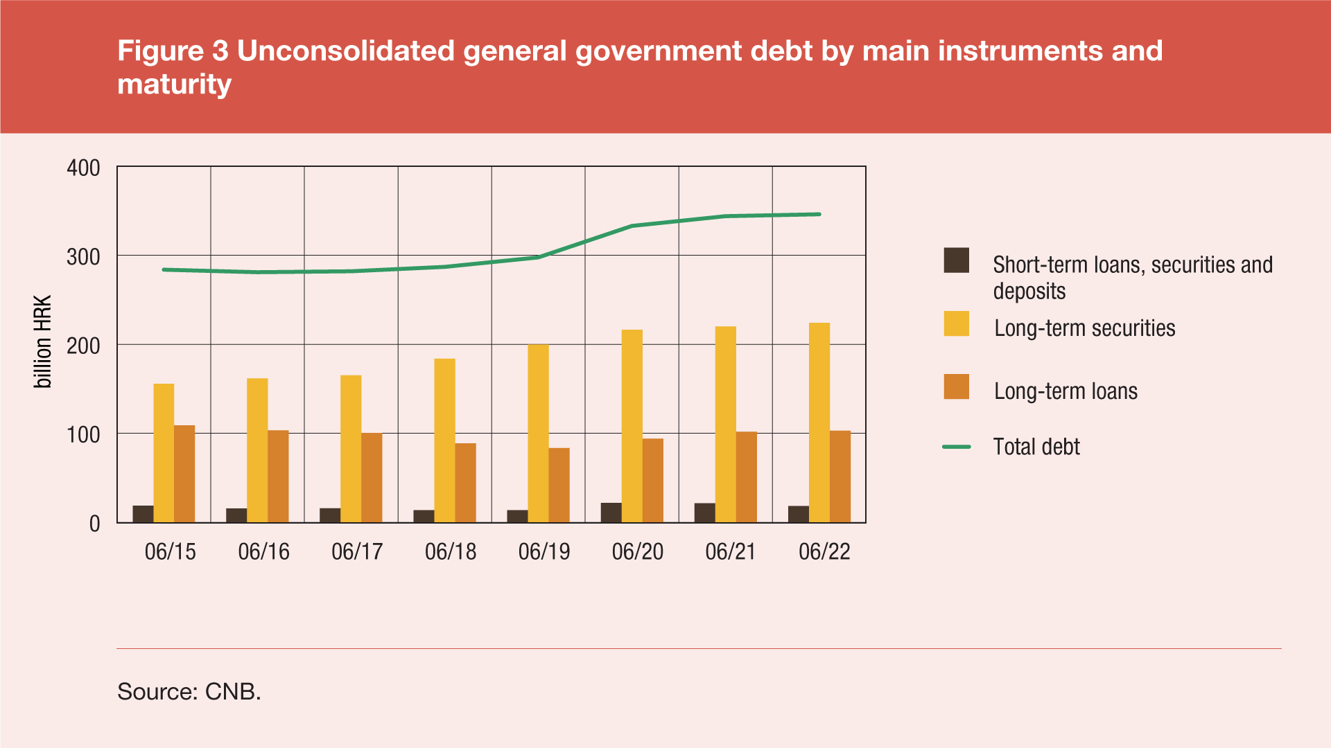 The general government debt structure by main debt instruments and maturity is available only on an unconsolidated basis[2]. Long-term debt instruments dominate the maturity structure of unconsolidated debt: at the end of June 2022 most of this debt was made up of bonds (64.8%), the second by importance were long-term loans (29.7%), and last were short-term loans, securities and deposits (jointly 5.5%). The short-term debt components decreased by HRK 3.1bn (or 14.3%) on an annual basis from the end of June 2021 to the end of June 2022, while the long-term debt components increased by HRK 5.5bn (or 1.7%) during the same period.