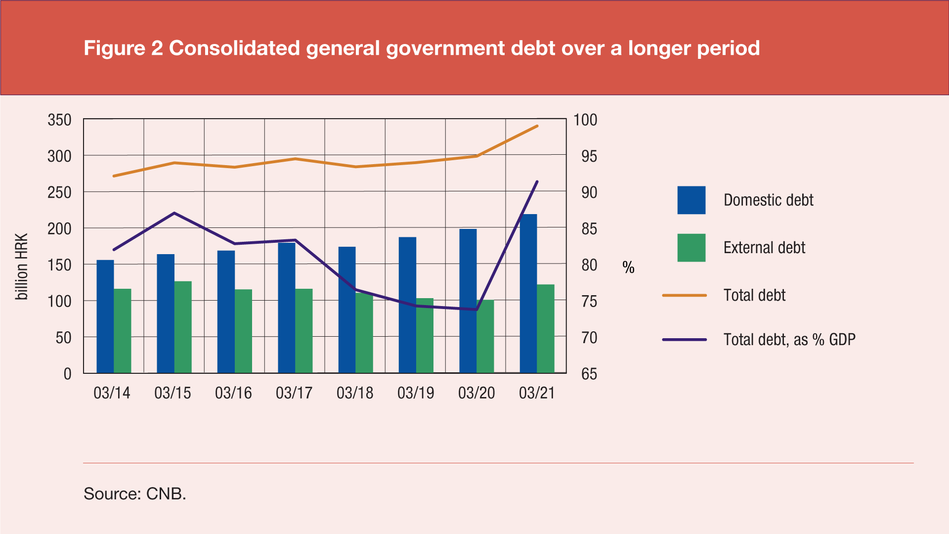 The total consolidated debt of all general government sub-sectors[1] reached HRK 340bn at the end of March 2021, up HRK 10.3bn (or 3.1%) since the end of the previous quarter and up HRK 41.5bn (or 13.9%) since the end of March 2020. This increase was to the greatest extent due to an increase in the foreign debt component in the amount of HRK 15.6bn (or 14.7%) in the first quarter of this year, with the annual increase of HRK 21.3bn (or 21.2%) in the last four quarters.