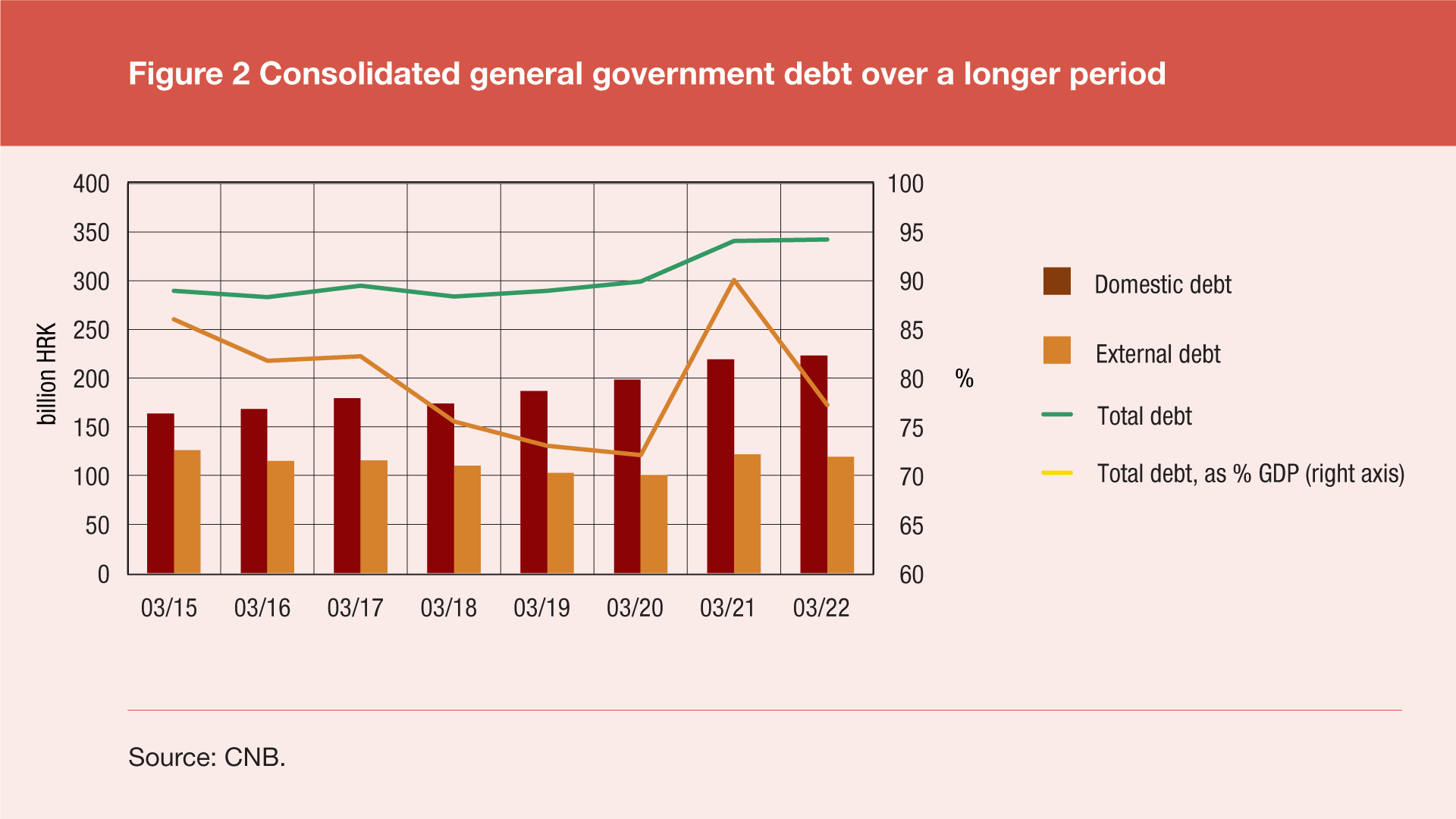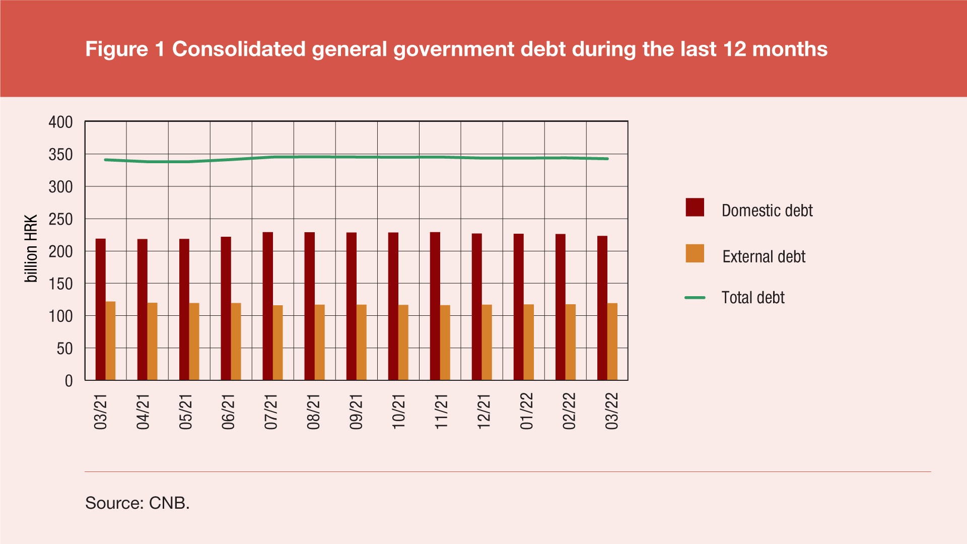 According to the final data of government finance statistics for the first quarter of 2022, the total consolidated debt of all general government sub-sectors[1] reached HRK 342.5bn at the end of March 2022, down HRK 1.1bn (or 0.3%) from the end of December 2021 and up by HRK 1.6bn (or 0.5%) from the end of March 2021. The annual debt growth was due to an increase in the domestic debt of HRK 4.1bn (or 1.9%) and a decrease in the external debt of HRK 2.5bn (or 2.0%). Domestic debt fell by HRK 3.5bn (or 1.6%), and external debt rose by HRK 2.4bn (or 2.1%) compared to the end of the previous quarter.