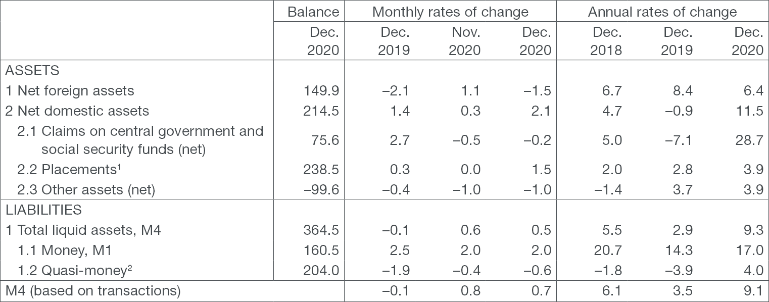 The growth of total liquid assets (M4) accelerated strongly in 2020, primarily due to the strong increase in net claims of monetary institutions on the central government. The structure of monetary growth also changed from the previous years due to stronger lending to the government.