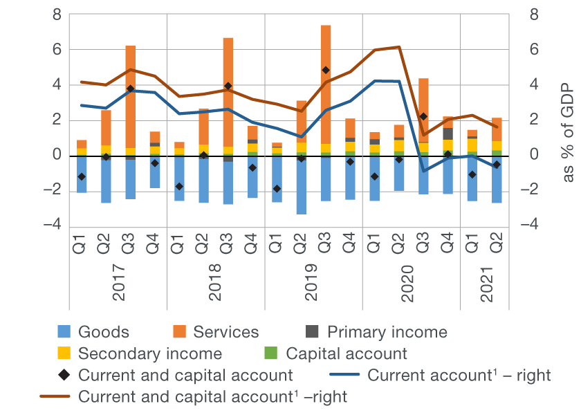 The current and capital account of the balance of payments ran a deficit of EUR 0.5bn in the second quarter of 2021, which is an increase of EUR 0.3bn from the same period of the previous year. If the last four quarters are observed, the surplus in the current and capital account in the period up to the end of June 2021 totalled 1.6% of GDP, which was 0.4 percentage points less than in the entire 2020.