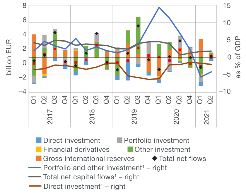 The financial account of the balance of payments recorded a net capital outflow of EUR 0.2bn in the second quarter of 2021 (Figure 1b), an increase of EUR 0.1bn from the same period of the previous year. Broken down by individual accounts, this year’s net capital outflow was largely the outcome of the growth in gross international reserves. In addition, net liabilities in the account of other investments declined slightly. At the same time, the foreign direct investment account saw a net capital inflow, that is, the rise in net liabilities, while no major changes were seen in portfolio investments, as the increase in government liabilities arising from short-term debt securities was offset by the roughly equal growth in assets associated mostly with investments of domestic institutional investors in foreign shares and equity holdings.
