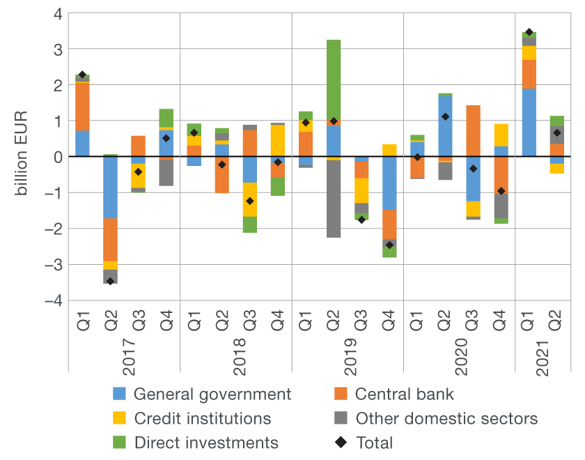 The mild net capital outflow (of EUR 0.1bn) in the other investment account in the second quarter of 2021 was the result of a slightly larger increase in assets than in liabilities. Central bank’s assets grew the most, driven by the rise in banks’ funds within the TARGET2 system[2] (of EUR 0.6bn), while the growth in central bank’s liabilities (of EUR 0.4bn) was the result of the increased volume of repo transactions, which have a neutral impact on the overall financial account balance because they simultaneously raise international reserves by the same amount.[3] The net outflow of capital was also due to a reduction in government net liabilities, while the increase in net liabilities of credit institutions and other domestic sectors had the opposite effect.