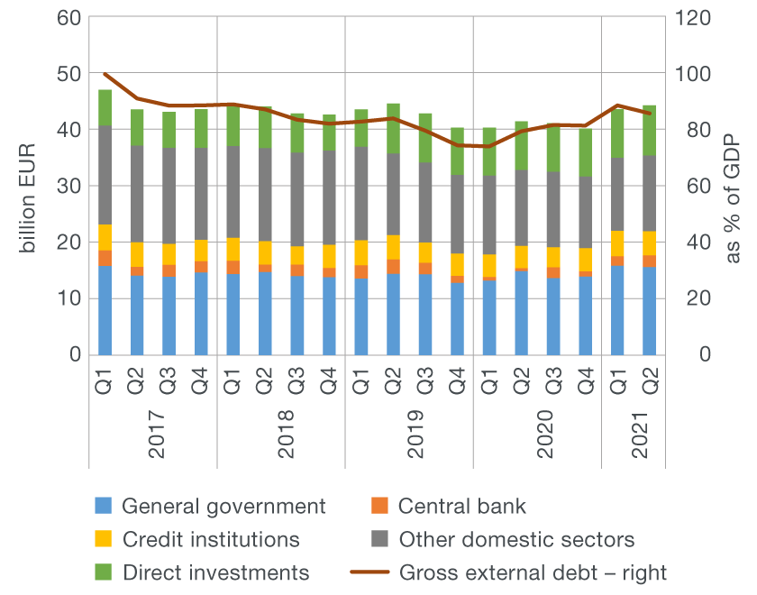 The stock of gross external debt grew by 0.7bn in the second quarter of 2021 (Figure 2a). The sharpest increase (of EUR 0.8bn) was seen in the debt of other domestic sectors (private non-financial corporations), including their liabilities to affiliated creditors, followed by that of the central bank (of EUR 0.4bn), as a result of the said increase in the volume of repo transactions. By contrast, credit institutions and general government reduced their debt, by EUR 0.3bn and EUR 0.2bn, respectively. Accordingly, total gross external debt stood at EUR 44.2bn or 85.6% of GDP at the end of June 2021, decreasing by 2.8 percentage points from the end of March, thanks to nominal GDP growth (Figure 2b).