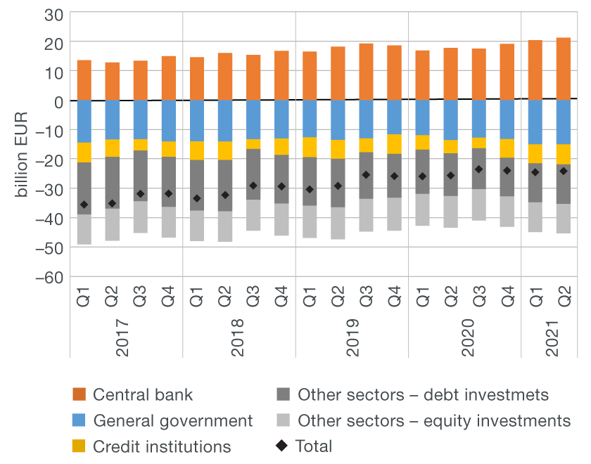 The fall in net external debt led to an improvement in the net international investment position, from EUR –24.5bn at the end of March to EUR –24.2bn at the end of June 2021. The net foreign position of the central bank improved the most, which was mitigated by the deterioration in the position of credit institutions (Figure 3a). As a result of the decrease in net external debt, the relative indicator of the net international investment position improved, from –49.8% of GDP at the end of March to –46.8% of GDP at the end of June 2021 (Figure 3b).