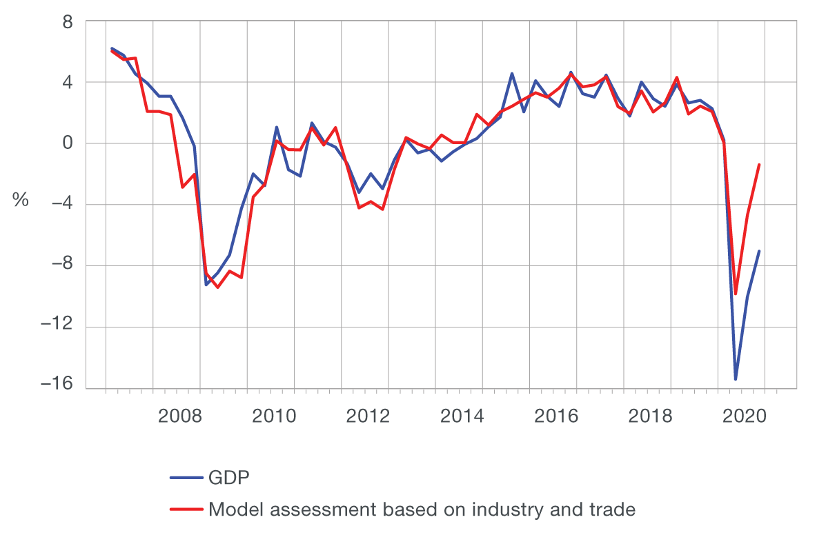 The quarterly GDP data are usually available with a relatively large time lag, which hampers the assessment of the current state of the economy and the development of long-term projections. The Croatian Bureau of Statistics releases the first GDP estimate two months after the end of the quarter, which is one of the largest lags among the EU member states. For this reason, economists develop models for nowcasting GDP based on the available monthly indicators, such as industrial production and retail trade. Figure 1 thus illustrates that the annual real GDP growth rate could be well approximated using the dynamics of the available indicators before the onset of the pandemic. However, in the last three quarters the predictive capacity of these indicators in estimating GDP has been weakening and they alone could not capture the depth of the current recession. One of the key reasons for the weaker correlation between GDP and the standard monthly indicators is found in the asymmetric impact of the pandemic on a part of service activities relative to some other activities, such as manufacturing, trade or construction. Thus, for example, retail trade used to be a good indicator of the dynamics of personal consumption and therefore of GDP. However, the trade turnover during the pandemic recovered relatively quickly after the initial sharp decline, in contrast to other consumption components, primarily associated with the accommodation and catering services, which are still considerably below the pre-pandemic level.