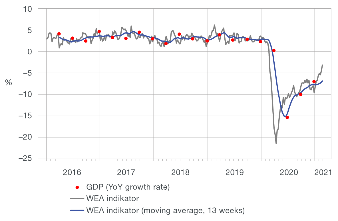 Figure 2 compares the annual quarterly GDP growth rate (red) with the WEA indicator at a weekly (grey) and quarterly (blue) frequency, which was constructed using the 13-week moving averages. The moving averages at the end of each quarter track very closely the realised rates of change in GDP in that quarter, which indicates the reliability of the WEA indicator in monitoring the dynamics of real activity at a weekly level, in particular its strong and sudden changes during the pandemic. The WEA indicator thus showed that economic activity had reached bottom as early as in mid-April, almost immediately after the outbreak of the pandemic and the imposing of epidemiological measures, when the highest estimated rate of decline exceeded 20 percent at a weekly level. This was followed by the recovery in economic activity, which was very rapid at first, so that by the end of the second quarter economic activity already made up for a half of the initial loss. The slowdown in the pace of recovery in the third and the fourth quarter held economic activity by the end of 2020 at the level approximately 7% lower than in the same period of 2019. The new weekly indicator suggests that economic activity is gradually recovering towards the end of February and that similar trends will continue in 2021. As soon as data for March become available, we expect that this recovery will accelerate due to the easing of restrictions with regard to certain service activities, while the annual growth rate will also be pushed forward by the base effect associated with the start of the pandemic and the decline in all relevant indicators in March 2020. All of this supports the expectations of more favourable developments in economic activity at an annual level in March, which might eventually result in a smaller fall in GDP in the first quarter of the current year from the decline recorded in the last quarter of 2020.