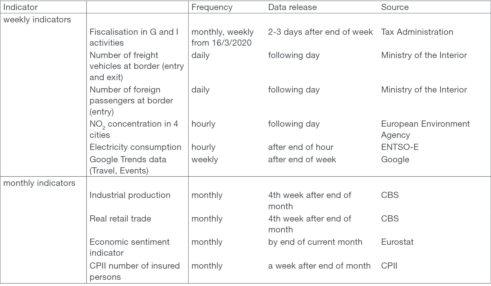 We constructed the composite Weekly Economic Activity (WEA) indicator based on the dynamics of eight weekly and four monthly indicators presented in Table 1. The most important criterion for the selection of weekly indicators was their correlation with the quarterly GDP dynamics, in particular during the pandemic. The Tax Administration data on fiscalisation, the data on certain keyword searches on Google, the consumption of electricity, the air pollution with Nitrogen Dioxide (NO2) and the data of the Ministry of the Interior on cross-border traffic proved to be the most useful data among the set of tested data series.