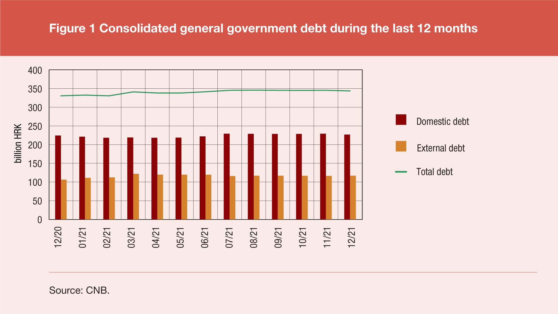 According to final data, the total consolidated debt of all general government sub-sectors[1] reached HRK 343.6bn at the end of December 2021, down HRK 1.7bn (or 0.5%) from the end of September 2021 and up by HRK 13.2bn (or 4%) from the end of December 2020. The annual debt growth was due to an increase in the domestic debt of HRK 2.5bn (or 1.1%) and in the external debt of HRK 10.7bn (or 10.1%). Domestic debt fell by HRK 1.7bn (or 0.7%), and external debt remained almost unchanged from the previous quarter.