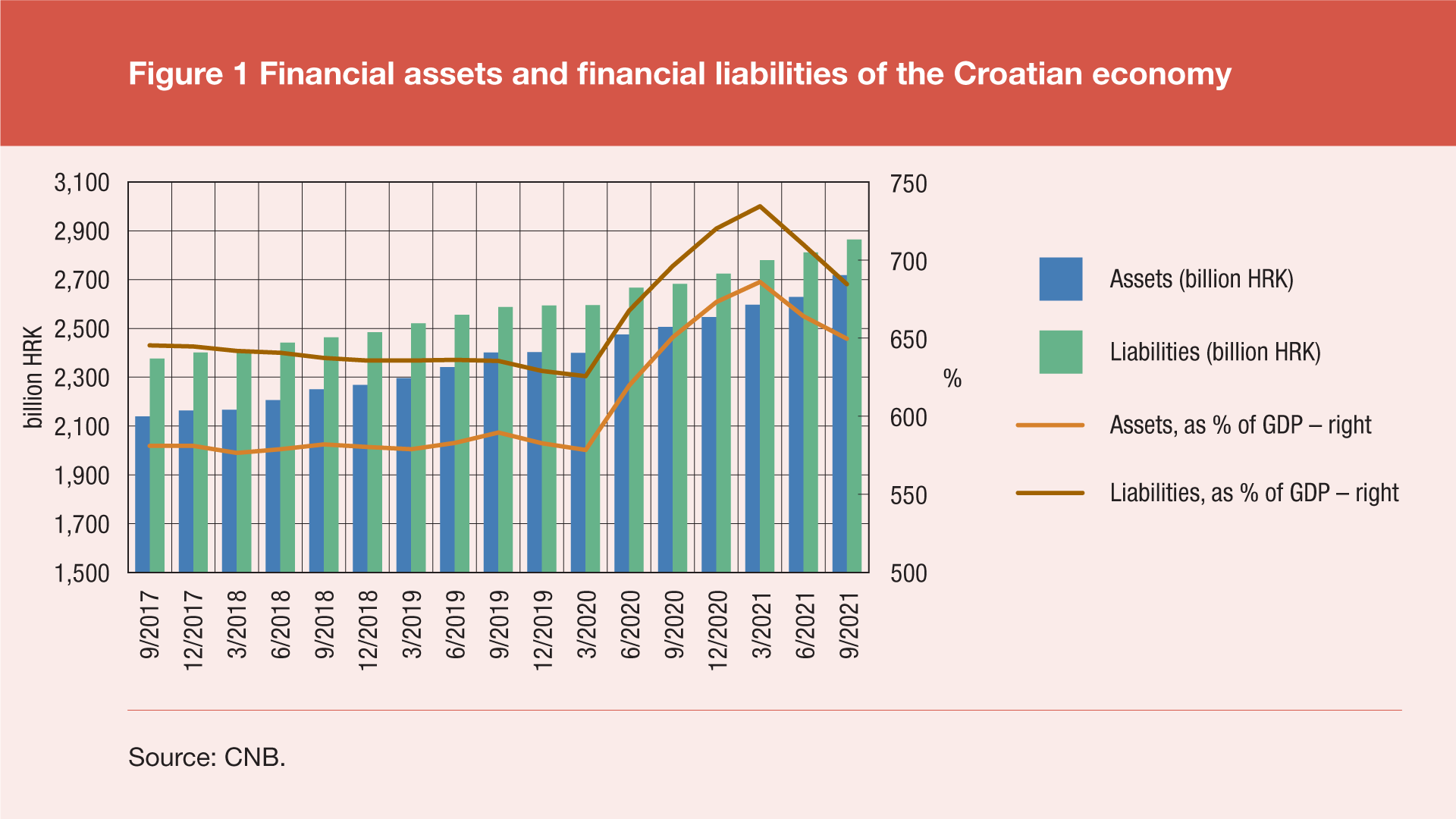 The financial assets of the Croatian economy stood at HRK 2,718bn at the end of the third quarter of 2021 (Figure 1), up by HRK 89.1bn in the quarter concerned and by HRK 211.9bn in the period of one year. The financial liabilities of the Croatian economy reached HRK 2,864bn, up by HRK 53.3bn in the quarter concerned and by HRK 182.4bn in the period of one year. In terms of GDP, the financial assets of the Croatian economy amounted to 650% of the annual GDP at the end of the third quarter of 2021, down by 14.4 percentage points in the quarter concerned and down by 1.0 percentage points in the period of one year. The financial liabilities of the Croatian economy decreased by 25.4 percentage points in the quarter concerned and by 11.7 percentage points in the period of one year, accounting for 685% of the annual GDP at the end of the third quarter of 2021. These quarterly developments continue the trend of decrease of both assets and liabilities of the Croatian economy in terms of GDP, which has started in the previous quarter due to a slower increase in their value compared to the growth of quarterly GDP.