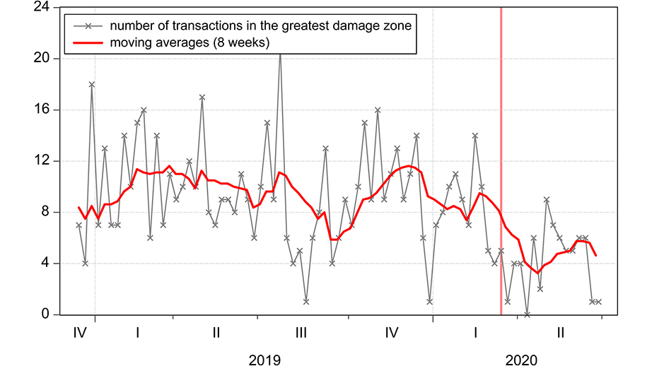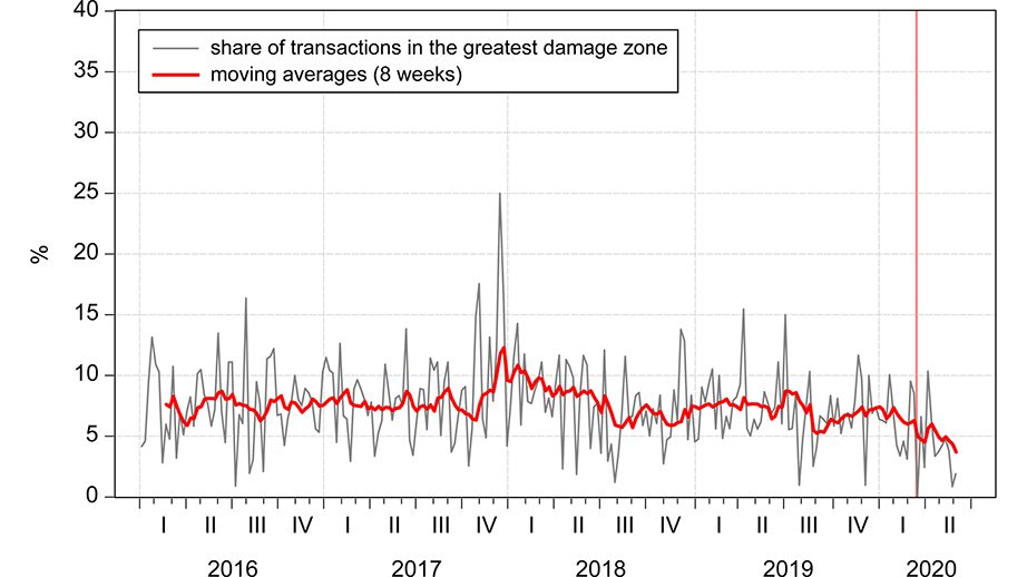 Figure 1 Number and share of transactions on a weekly level in the greatest damage zone