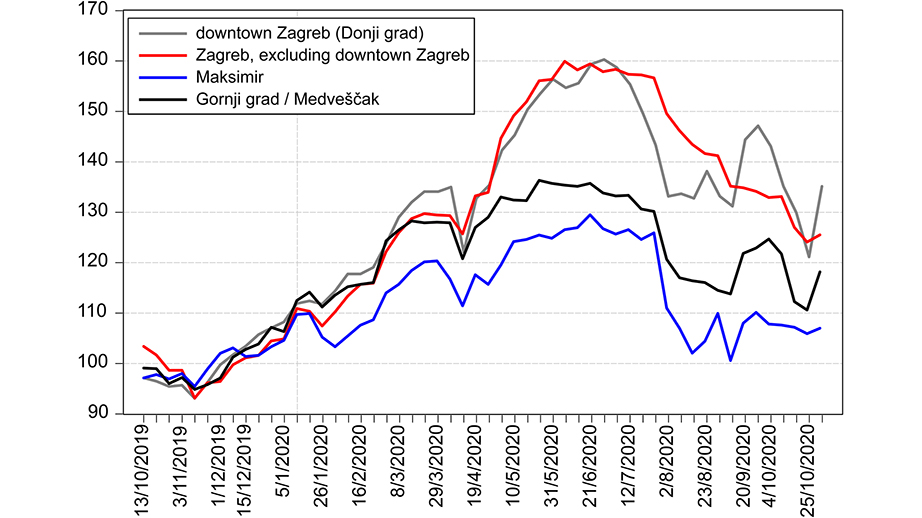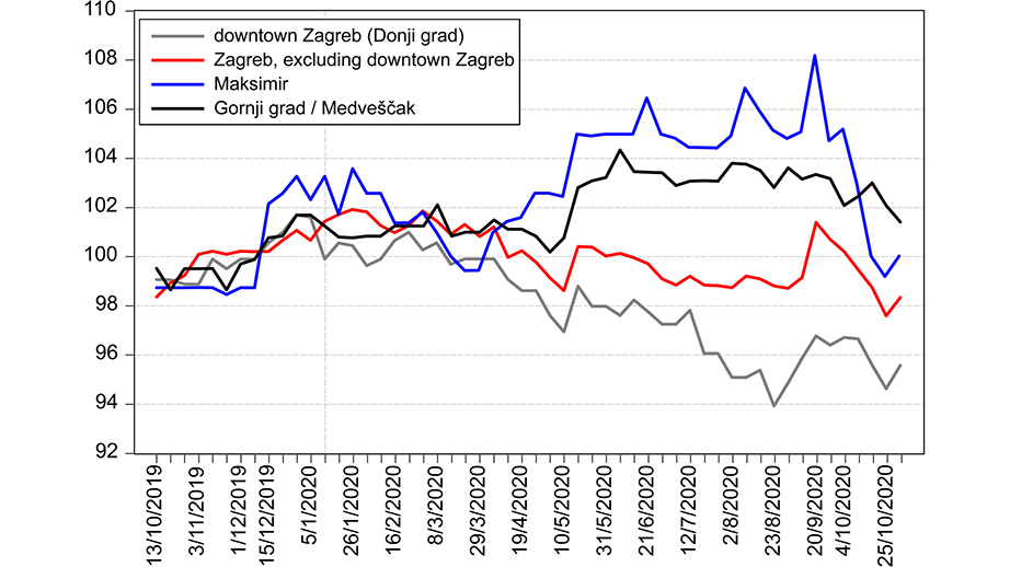 As a result, the fall in the demand for real estate in the city centre for tourist purposes coincides with a rise in the offer of dwellings for long-term rent or purchase in that part of town. All this is mirrored in rent prices in the central part of the town. This is clearly shown in Figure 2 that compares price indices (2.b) and the number of properties advertised (2.A) on the Njuškalo web portal for downtown Zagreb and two parts of town that are regarded as its substitutes, Maksimir and Gornji grad / Medveščak and finally for the entire city of Zagreb, downtown Zagreb, excluded. The number of dwellings put up for rent has risen in all the analysed parts of town since early 2020, partly as a result of the mentioned change in real estate use throughout the city. However, after the earthquake the number of advertised dwellings in downtown Zagreb, which includes the parts of the city most affected by the earthquake and numerous short-term rentals, grew much faster than that in Maksimir, Gornji grad and Medveščak. A comparison of the rent price indices shows that the prices of rent in downtown Zagreb fell compared to other parts of the city, particularly compared to Maksimir, Gornji grad and Medveščak, the substitutes for downtown Zagreb.