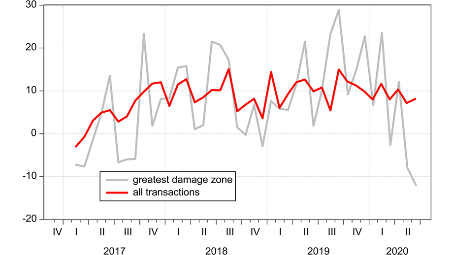 The number of properties sold in the centre of the City of Zagreb and particularly in downtown Zagreb (Donji grad), which has the highest density of real estate damaged in the earthquake, halved in the past months (Figure 1).[1] The reduced inclination to purchase a property in the city centre also does not necessarily need to be ascribed to the earthquake alone. The constructed weekly indicators show that the number and share of transactions relating to the zone damaged in the earthquake (zone0 in Figure 5) started falling a few weeks prior to the earthquake. This fall in the real estate market activity is coincidental with the onset of the pandemic, as the procedure of real estate purchase and sale transactions became more complex due to the introduced epidemiological measures. Reduced activity in that area is in line with rising attractiveness of living outside the city centre and new life trends instigated by the pandemic, such as physical distancing or working from home.