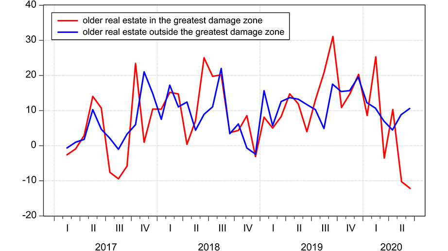 Figure 4 Prices of real estate built before 1964 within and outside the zone of greatest damage caused by the earthquake and differences between them
